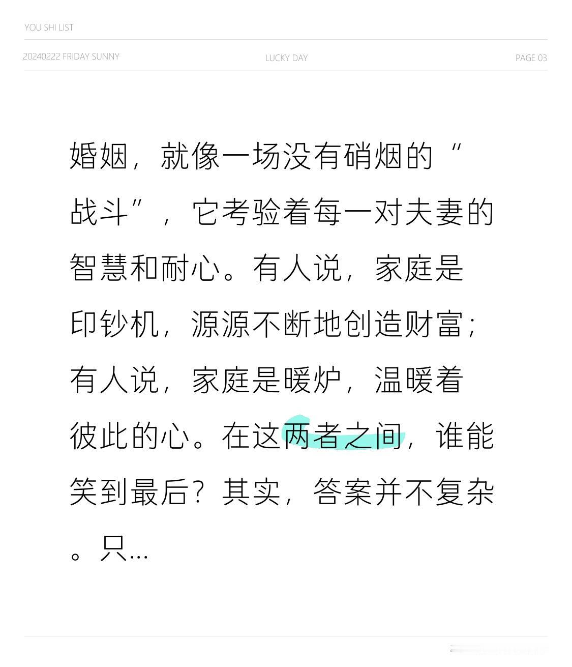 婚姻,就像一场没有硝烟的“战斗”,它考验着每一对夫妻的智慧和耐心。有人说,家庭是印钞机,源源不断地创造财富;有人说,家庭是暖炉,温暖着彼此的心。在这两者之间,谁能笑到最后?其实,答案并不复杂。只要用心去体会人性与现实的交织,就能找到那份属于自己的平衡。 婚姻中,最激烈的“战场”往往不是外界的风风雨雨,而是“钱”和“陪伴”的拉锯战。你会发现,许多家庭的矛盾,源自于钱包的厚度和陪伴的时间。有的人月入五千,却偏偏要买豪车,嘴里说“努力挣钱是为了家”,心里却藏着“我得让你看得起我”的心思。其实,这是一场成年人之间的“你拼我等”的游戏。男人拼命工作,为的是给家人更好的生活,但却常常忽略了,家人更渴望的是他的陪伴和关心。女人在家守着一锅平凡的饭菜,期待着丈夫的一句温暖,但往往只是默默等待。家庭的平衡,就像一根绷紧的弦,稍有偏差,就可能断裂。 挣钱的辛酸,许多“家庭的顶梁柱”都深有体会。那些早出晚归、深夜加班的男人(或女人),背负着房贷、孩子、老人等一座座沉重的山峰。你拼命干活,心里想着:“我这么努力,是不是为了让你过得更好?”然而,家里的另一半也在期待着你的陪伴和理解。两个人都在“忙”,感情就像那锅煮开的水,稍不留意,就会溢出来。钱可以买到房子、车子、名牌,但买不到“懂我心酸的眼神”和“愿意陪我发呆的肩膀”。你用尽全力养家,却可能“养不起”那份温暖和理解。 在这场婚姻的“游戏”中,爱情的“续费”也尤为重要。有人说,婚姻里最难熬的,不是口袋空空,而是你在外拼命,我在家望眼欲穿的心碎。你为家庭奔波,家却像个“冷宫”,饭菜时冷时热,微信里发个“我爱你”,对方却回复“你忙吧”。生日礼物或许能让银行卡数字涨一涨,但那份“你懂我心事”的温度,却不是钱能买到的。钱可以让你住豪宅、开豪车,但买不到“你在我身边的那份安心”。家庭的温暖,不在于物质的丰盈,而在于彼此心灵的贴近。 智慧的婚姻生存法则,才是真正的“高手”之道。真正懂得婚姻的人,不是比谁更“苦”,而是懂得“钱”和“陪伴”如何平衡。挣钱,是根基,就像树的根,扎得深扎得稳;而感情,是树的叶子,绿油油的,没有叶子,树就枯萎。夫妻之间,不能把家变成“战场”,而要学会理解和包容。你在外拼搏,也别忘了回头看看,家里的那个人是不是还在“守候”。而你在家,也要记得给对方一些“温暖的信号”。这样,钱会越存越多,感情也会越升越浓。 婚姻的真谛,其实不在于“钞票有多厚”,而在于“你懂我眼底的疲惫”。最珍贵的,不是银行账户的余额,而是有人愿意陪你“持续充值”,让你在平凡中感受到温暖。挣钱的目标,是把家变成坚固的堡垒;而陪伴,是用心把堡垒变成温暖的窝。有了这份“懂你”的心,家,才是真正的避风港。毕竟,婚姻不是一场比拼谁的财富多,而是一场关于理解和陪伴的长跑。只要用心经营,无论风雨多大,家都能成为你心中最温暖的港湾。婚姻 婚姻相处真相 情感婚姻的本质 对婚姻的深思