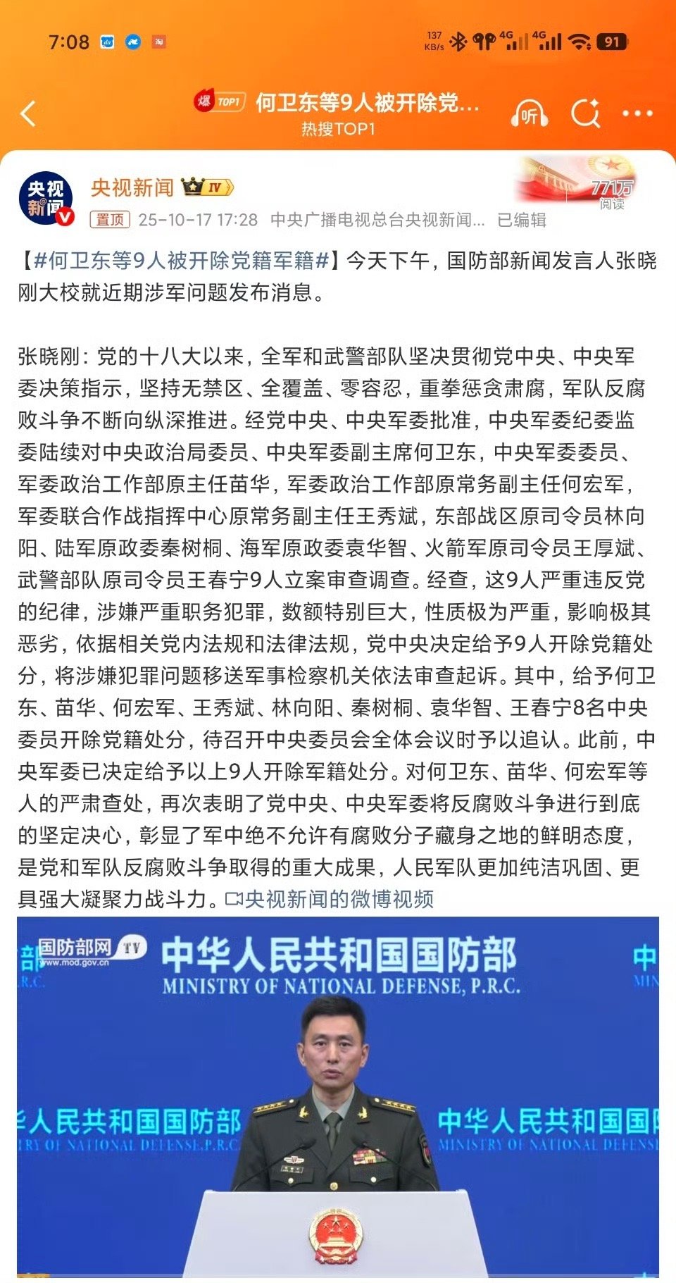 何卫东等9人被开除党籍军籍刮骨疗毒,老虎苍蝇一起抓,中网反腐,力度空前,历史上都不多见。从级别到频率上,就连巡查队伍里,也不放过👏 ​​​