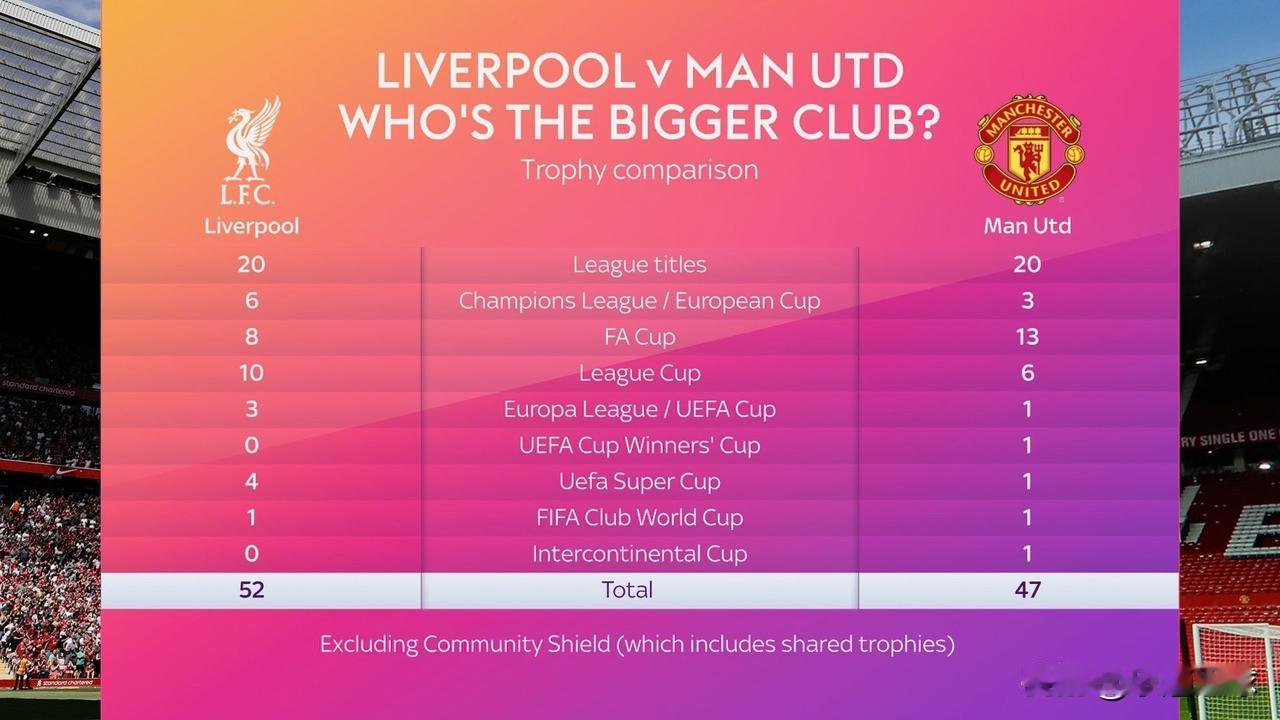 衡量一家俱乐部的伟大并不仅仅取决于奖杯数量。 - 曼联与皇家马德里、巴塞罗那并列世界前三的顶级俱乐部 - 根据《福布斯》数据,曼联目前以66亿美元市值位居全球第二,仅次于皇马(67.5亿美元),而利物浦以54亿美元排名第四 - 即便缺席欧冠且联赛排名第15位,仍能创造更高营收 - 全球球迷基数超越利物浦 - 社交媒体讨论度最高的英格兰俱乐部 - 拥有比利物浦更多标志性传奇球员 没有曼联的英格兰足球将失去灵魂。