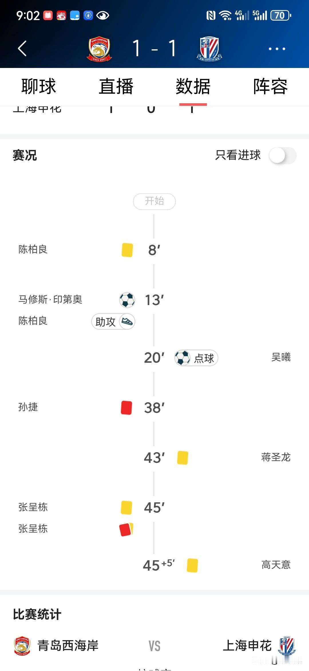 致敬青岛西海岸,上半场吃到两张红牌,被罚下两人,9打11,居然围攻上海申花,半场与申花战成1:1。 主裁判的判罚充满争议,包括边裁、视频裁判,均向有利于上海申花的判罚上努力。 戴维森的被踩踏,高天意应该也是一张红牌,视频裁判居然未介入,主裁判仅出示一张黄牌。