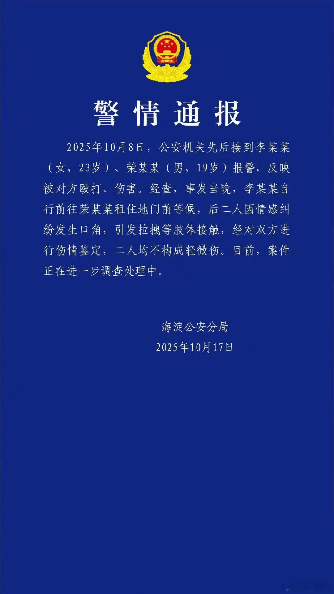 北京市海淀公安分局发布警情通报,先后接到李禹熹和荣梓杉报警,反映被对方殴打伤害。