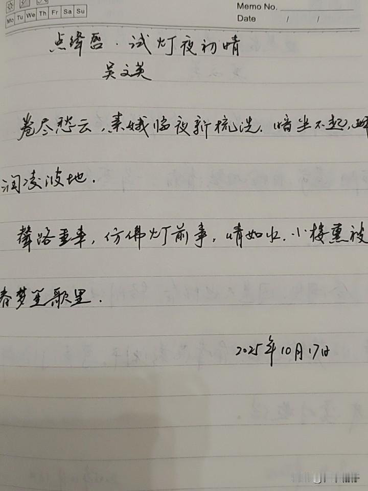 抄书第 974天(2025年10月17日) 静心✔ 戒浮躁,一笔一划。 今天继续抄《唐诗宋词三百首》之《点绛唇·试灯夜初晴》,这是宋代词人吴文英创作的一首词。宋词三百首历来与唐诗并称双绝,都代表一代文学之盛。 此词为元宵前夕观灯时之作。词人吴文英常借节令怀旧,这首词意境清新,端丽温厚,颇具特色。每日抄写 抄抄书 练练字 静静心