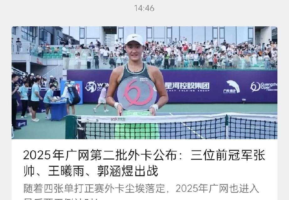 真正的大无语事件! 广州250赛官方今日发布消息称,张帅、王曦雨以及郭涵煜获得女单外卡,但郭涵煜随后“在线辟谣”,她并未获得外卡——广网的这篇文章目前也已经被删除。 广州250赛将于下周开赛,目前确定出战女单比赛的球员包括博萨斯、玛利亚、李安、埃拉、西尼亚科娃以及朱琳、王雅繁等球员。 目前不确定仅是郭涵煜无缘外卡,还是张帅、王曦雨以及郭涵煜均无缘外卡,如今唯一确定获得外卡的球员竟然是美国球员斯蒂文斯。而颇为诡异的是,前美网女单冠军本赛季至今0胜5负、且已经惨遭巡回赛11连败,斯蒂文斯为什么会获得外卡呢?