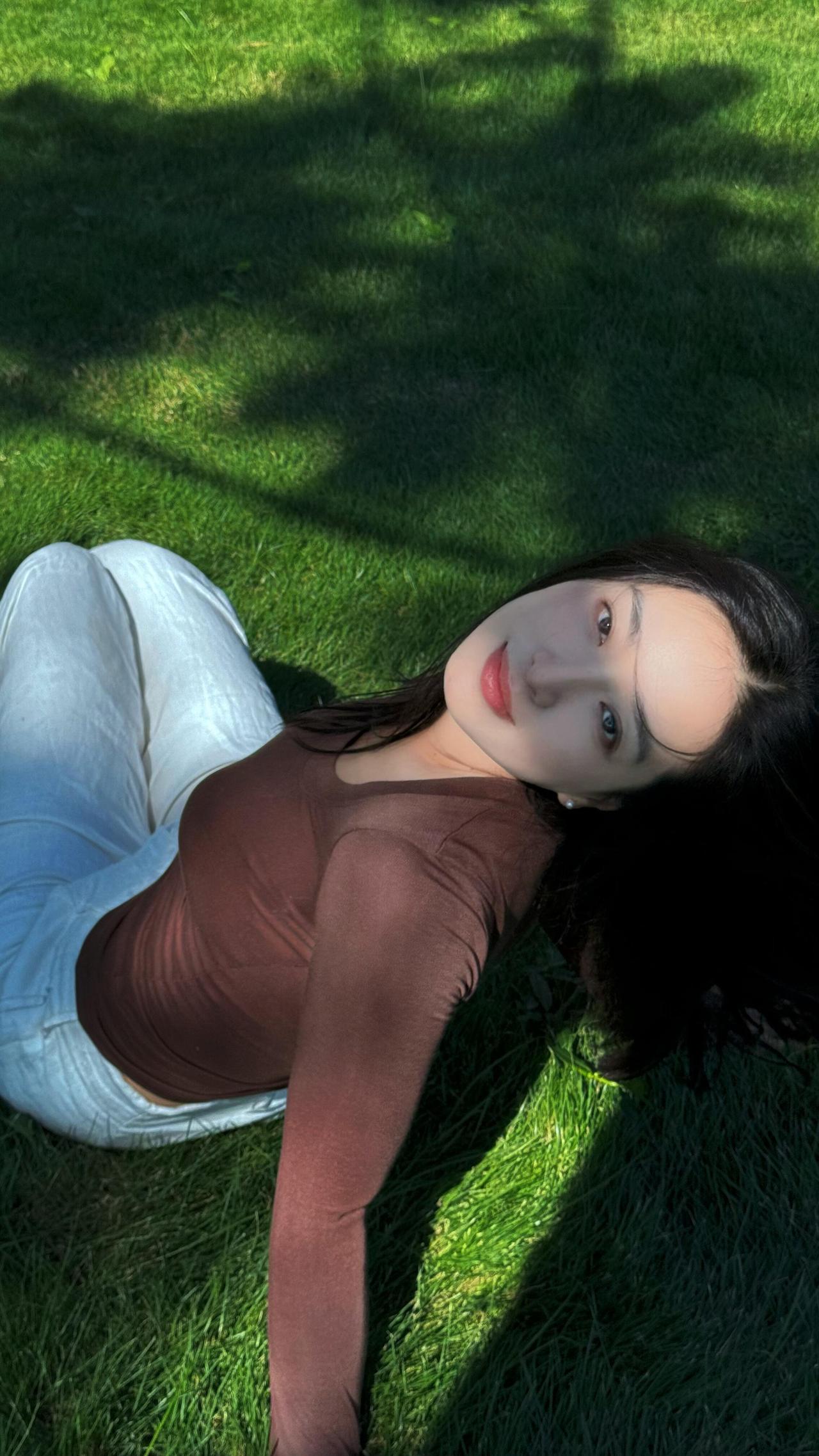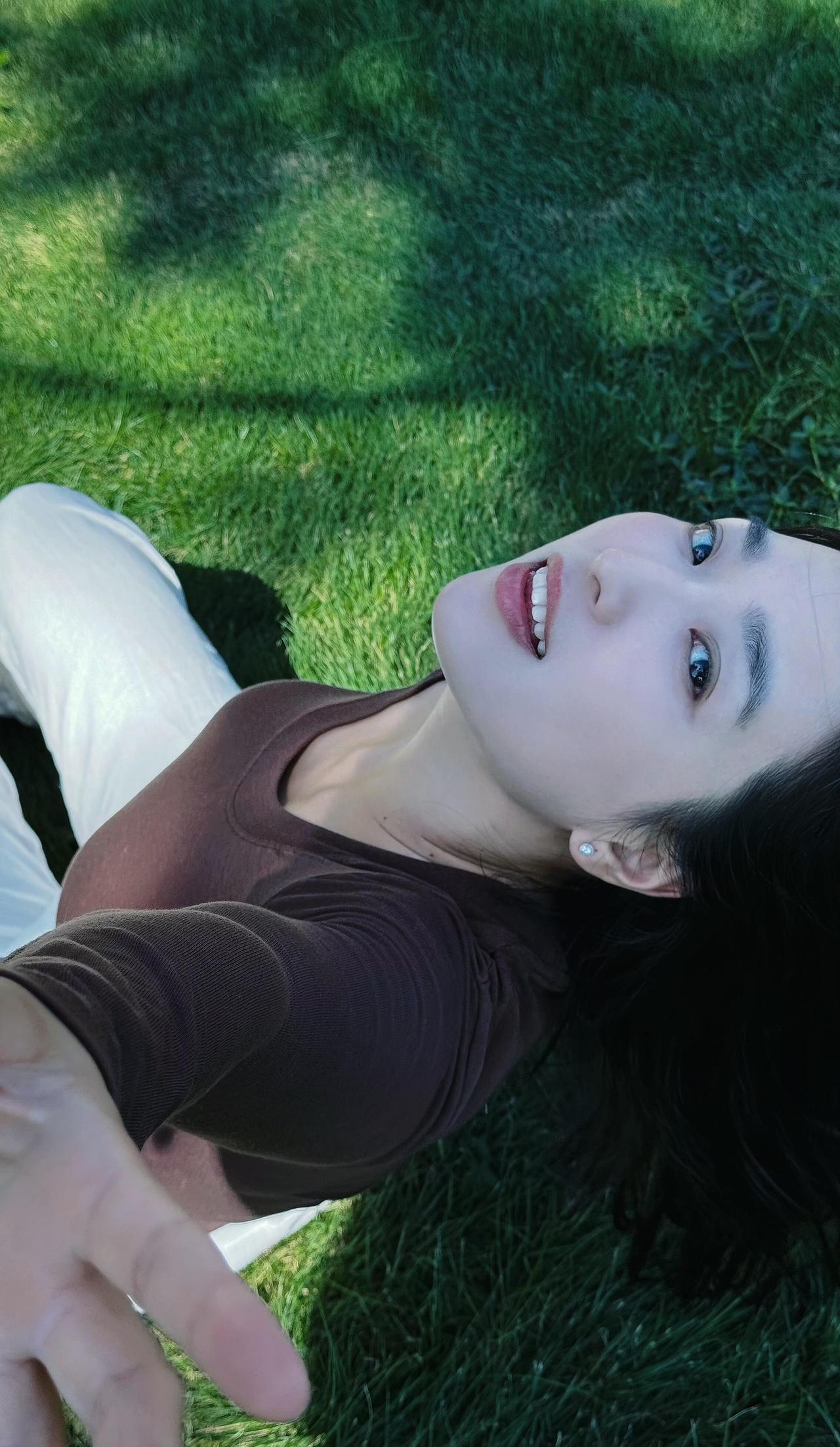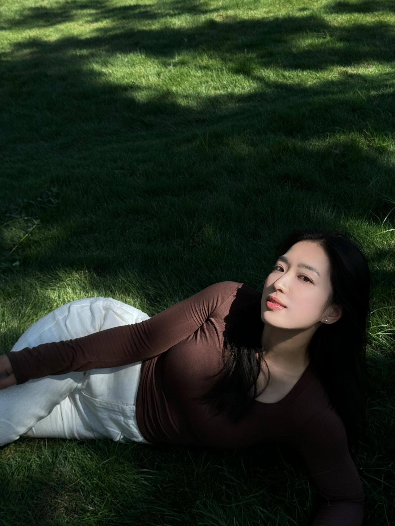 今天的黑色连衣裙,增添了几分性感与柔美,站在带有绿植投影的墙边,光影交错间,尽显