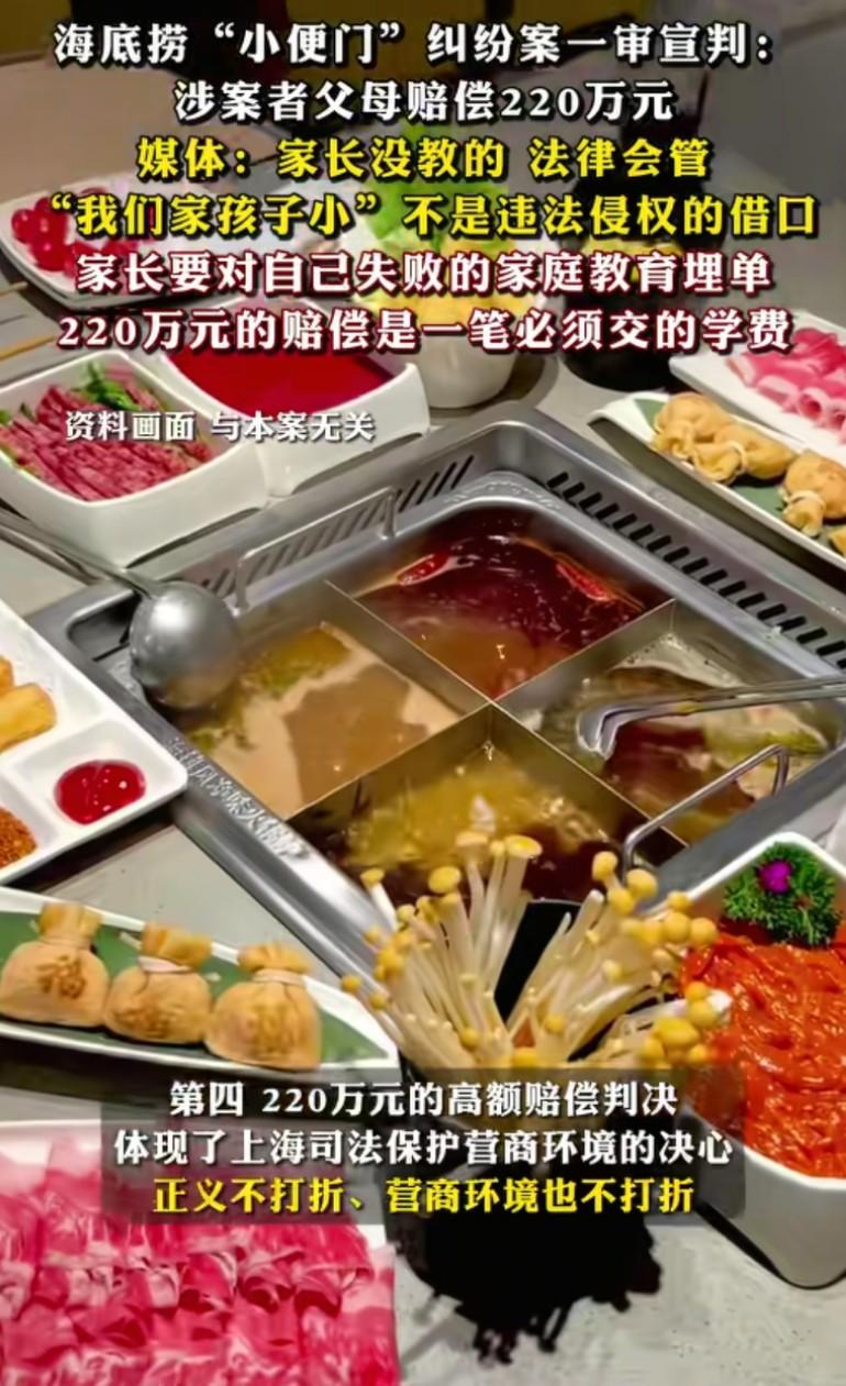 海底捞小便闹剧终判:220万天价赔偿!“孩子小”的遮羞布,在法律面前碎得稀烂! 海底捞“小便门”纠纷事件全梳理 事件经过 有消费者在海底捞就餐时,遭遇邻桌儿童在其就餐的火锅内小便的恶劣行为。事后,涉事儿童家长不仅未诚恳道歉、承担责任,还试图以“孩子小”为借口推脱。海底捞方面为维护品牌声誉和消费者权益,依法提起诉讼。 一审宣判结果 法院经审理后作出一审判决,判令涉事儿童的父母赔偿海底捞220万元。这一判决向社会明确传递了一个信号:“孩子小”绝不是违法侵权的借口,家长必须为自己失败的家庭教育买单,220万元的赔偿是他们必须缴纳的“法律学费”。同时,这一高额赔偿判决也体现了上海司法机关保护营商环境的决心,彰显了“正义不打折、营商环境也不打折”的态度。 致各位家长的警醒:看好孩子,做好教育是底线 各位家长,孩子的成长离不开家庭的教育引导。年龄小不是行为失当的“免罪金牌”,家庭教育的缺失,最终可能由法律来“补课”,甚至要付出沉重的经济代价和社会代价。 请务必在日常生活中,教会孩子基本的礼仪规范和法律边界,让他们明白什么事能做、什么事绝不能做。看好孩子,不仅是对孩子负责,也是对他人、对社会负责,更是在为孩子的人生筑牢根基。别让一时的疏忽或纵容,让孩子在错误的道路上越走越远,最终让整个家庭为失败的教育埋单。