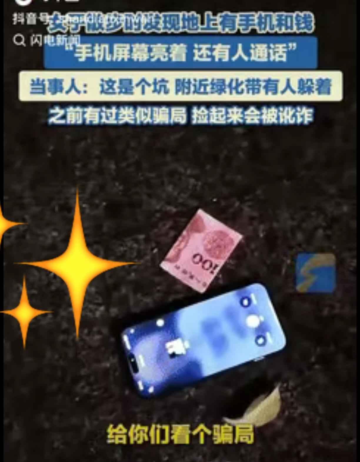 防不胜防!江苏扬州,女子走夜路时,突然看到地上有光亮和声音,走近一看,竟然是一部手机,旁边还有一张红彤彤的百元大钞,不过女子并没有上前捡起,总觉得哪里不对劲,果然往前走了几步,就发现绿化带中有一个人影,远远地盯着手机的方向。 你可别觉得这只是运气好没踩坑,夏女士能躲过,关键是她没被“天上掉的馅饼”冲昏头——换作有人觉得“捡个手机还能顺带得笔钱”,弯腰的瞬间可能就掉进圈套了。现在的骗子多精啊,知道单纯丢一袋钱容易被警惕,直接升级成“手机+现金”的组合,既利用大家想帮忙还手机的好心,又勾着贪小便宜的心思,等你一上手,立马跳出来说手机坏了、钱少了,夜黑人少没监控,你就算浑身是嘴也说不清。 其实分辨这种陷阱没那么难,真丢东西的人哪会把手机亮着屏、钞票摆得整整齐齐?要是路上碰到这种“刻意”的失物,别犹豫也别好奇,要么站远点观察,要么直接打110让警察来处理,既别让自己成了冤大头,也别给骗子可乘之机。 你们平时路上碰到这种可疑的东西会怎么做?是直接走开还是会多留个心眼?