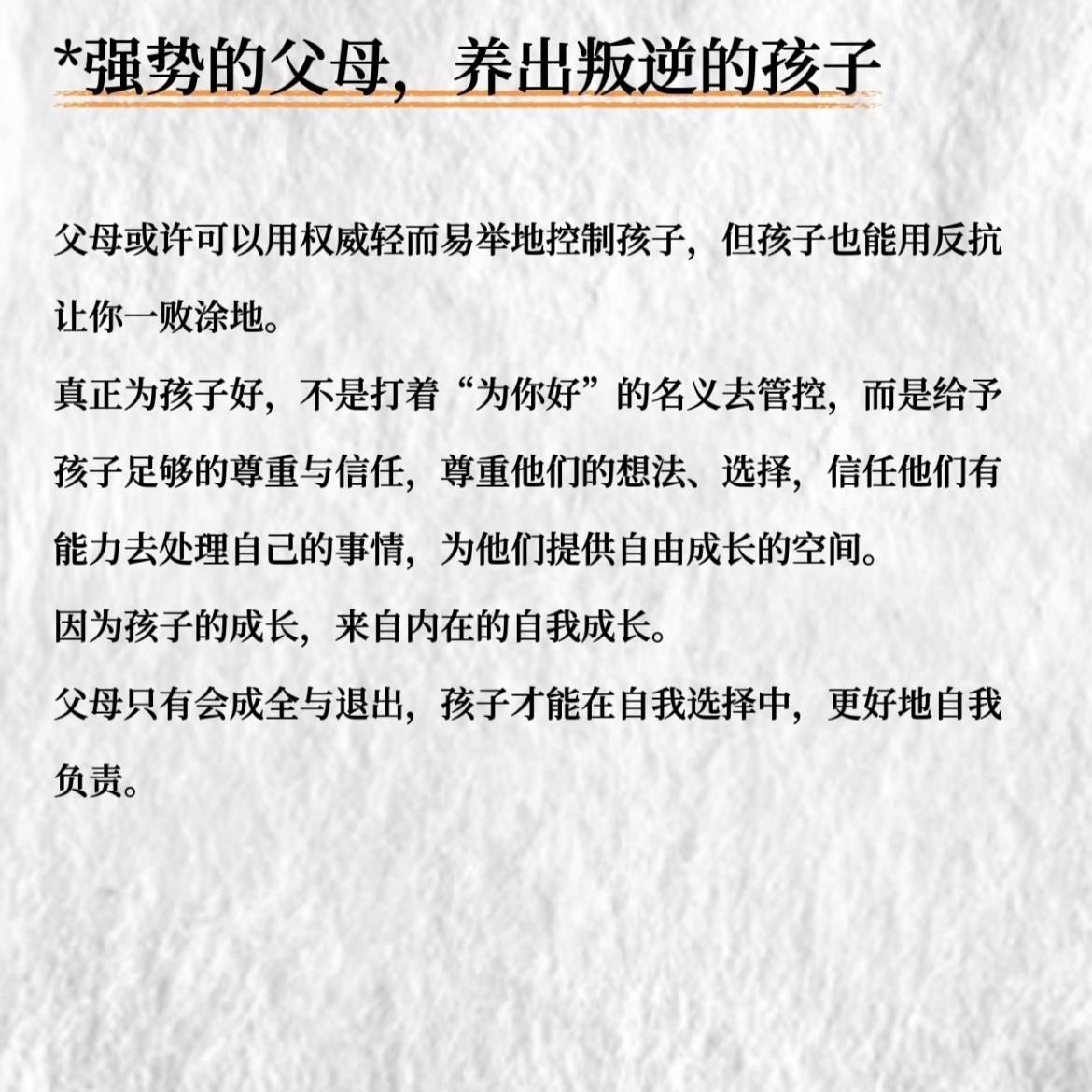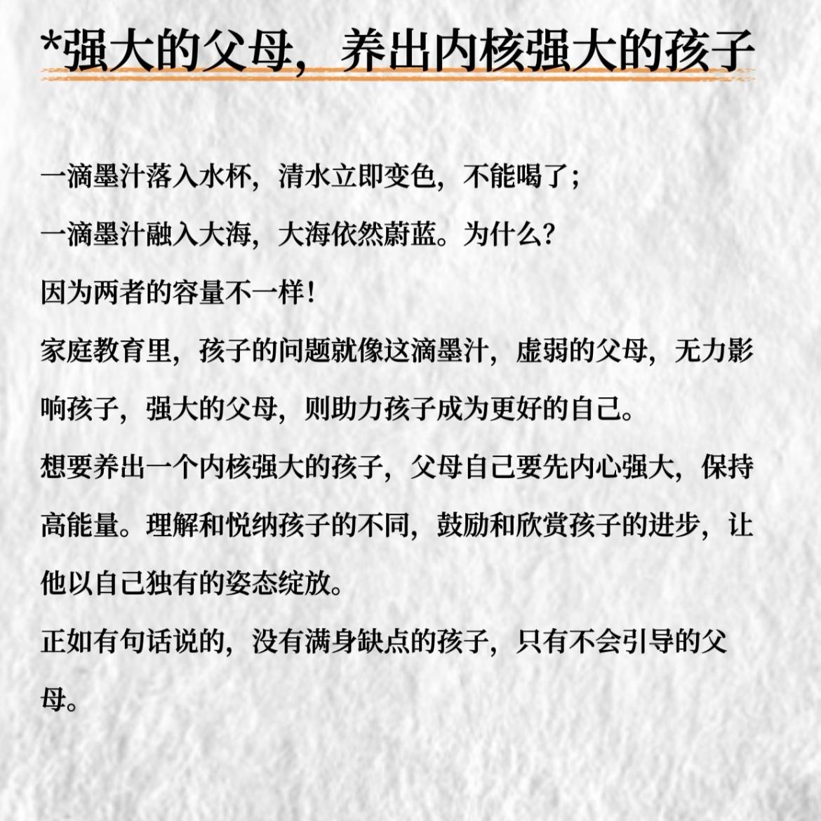 养育就是因果,父母是因,孩子是果 ✅每个人来到这个世界,就像一张白纸一样。而后,他生存的环境开始给他上色,他的环境是什么样的,他就会变成什么样的 *抱怨的父母,养出怨天尤人的孩子。 一个家庭走向不幸,往往是从家里有一个爱抱怨的人开始的。 父母什么生活态度,孩子就什么行为处事。 父母爱抱怨,传播的负能量就如肆意蔓延的病毒,让孩子也染上怨天尤人的“病”。 相反,父母积极向上,情绪松弛,才能为孩子的人生注满温暖和希望。 *强势的父母,养出叛逆的孩子。 父母或许可以用权威轻而易举地控制孩子,但孩子也能用反抗让你一败涂地。 真正为孩子好,不是打着“为你好”的名义去管控,而是给予孩子足够的尊重与信任,尊重他们的想法、选择,信任他们有能力去处理自己的事情,为他们提供自由成长的空间。 因为孩子的成长,来自内在的自我成长。 父母只有会成全与退出,孩子才能在自我选择中,更好地自我负责。 *自私的父母,养出敏感内耗的孩子。 我们之所以把一个孩子带到这世上,难道不是为了陪伴他长大,让他幸福吗? 为人父母,我们或许做不到绝对无私,但决不能自私。 我们应该成为孩子遮风避雨的港湾,而不是给孩子带来风雨的始作俑者。 🍀 *强大的父母,养出内核强大的孩子。 一滴墨汁落入水杯,清水立即变色,不能喝了; 一滴墨汁融入大海,大海依然蔚蓝。为什么? 因为两者的容量不一样! 家庭教育里,孩子的问题就像这滴墨汁,虚弱的父母,无力影响孩子,强大的父母,则助力孩子成为更好的自己。 想要养出一个内核强大的孩子,父母自己要先内心强大,保持高能量。理解和悦纳孩子的不同,鼓励和欣赏孩子的进步,让他以自己独有的姿态绽放。 正如有句话说的,没有满身缺点的孩子,只有不会引导的父母。 *坚韧的父母,养出敢闯敢拼的孩子。 父母的一言一行,是孩子的一面镜子,映照出孩子的未来。 把自己活得热气腾腾的父母,给孩子带来精神上的滋养,让孩子无畏困难,勇敢前行。 ✅父母的活法,就是孩子人生的教科书。 人生智慧 教育的意义在于唤醒 教育的本质 努力成为更好的自己 人生感悟 养育孩子 教育的本质究竟是什么 家庭的力量 理解父母成为父母 自我提升家长养育 养育心理 养育儿女 养育家庭 因果孕育法则人间的因果 家长养育之道 养育孩子 父母孩子人生 家长养育 养育心理 养育儿女