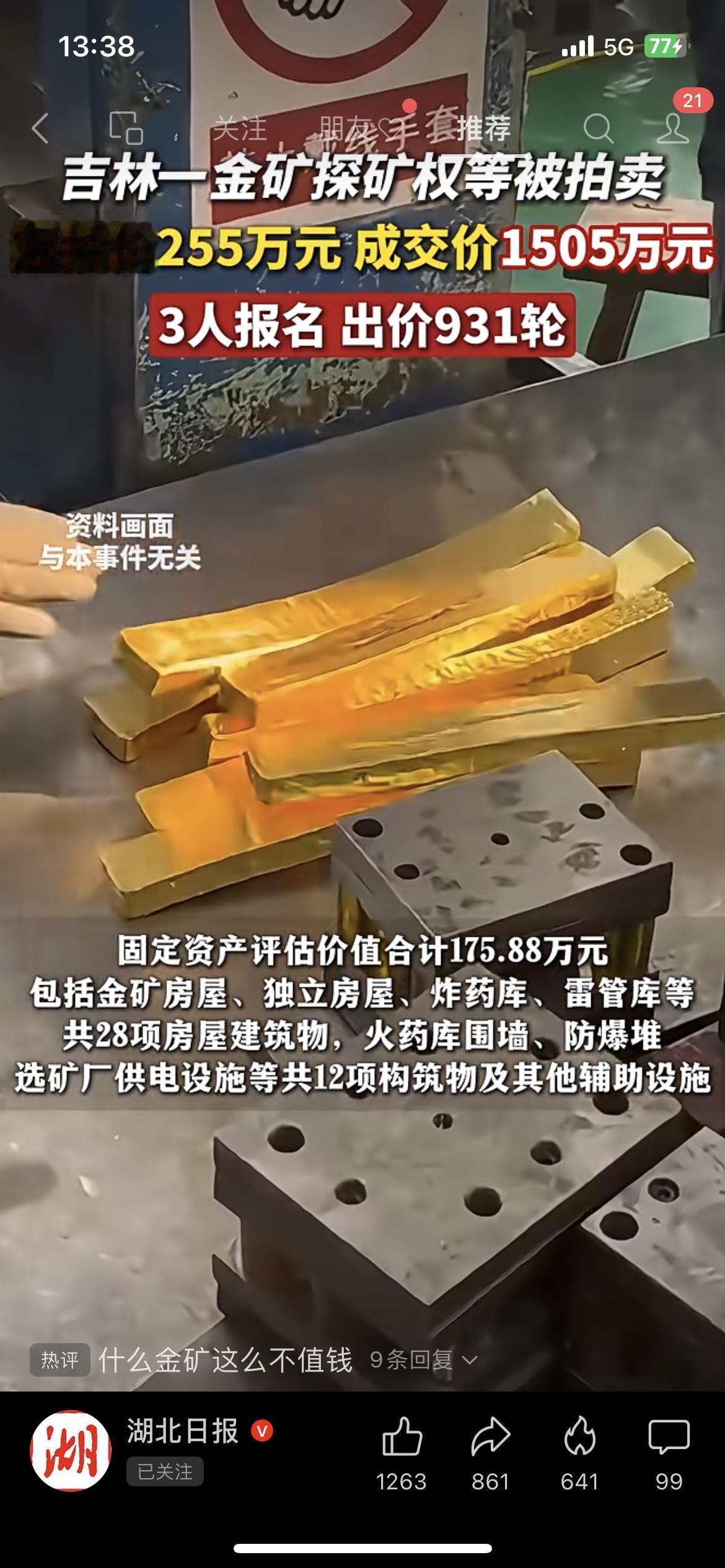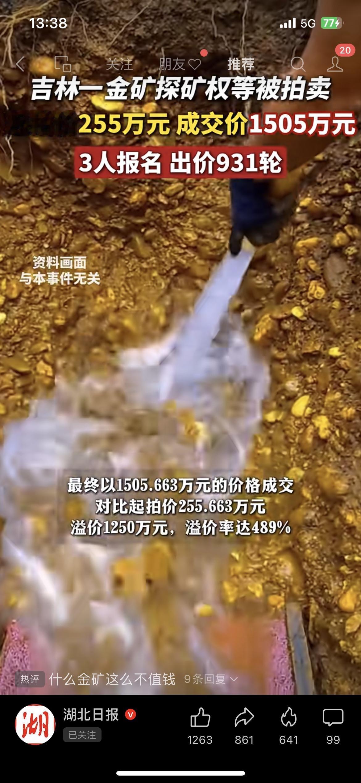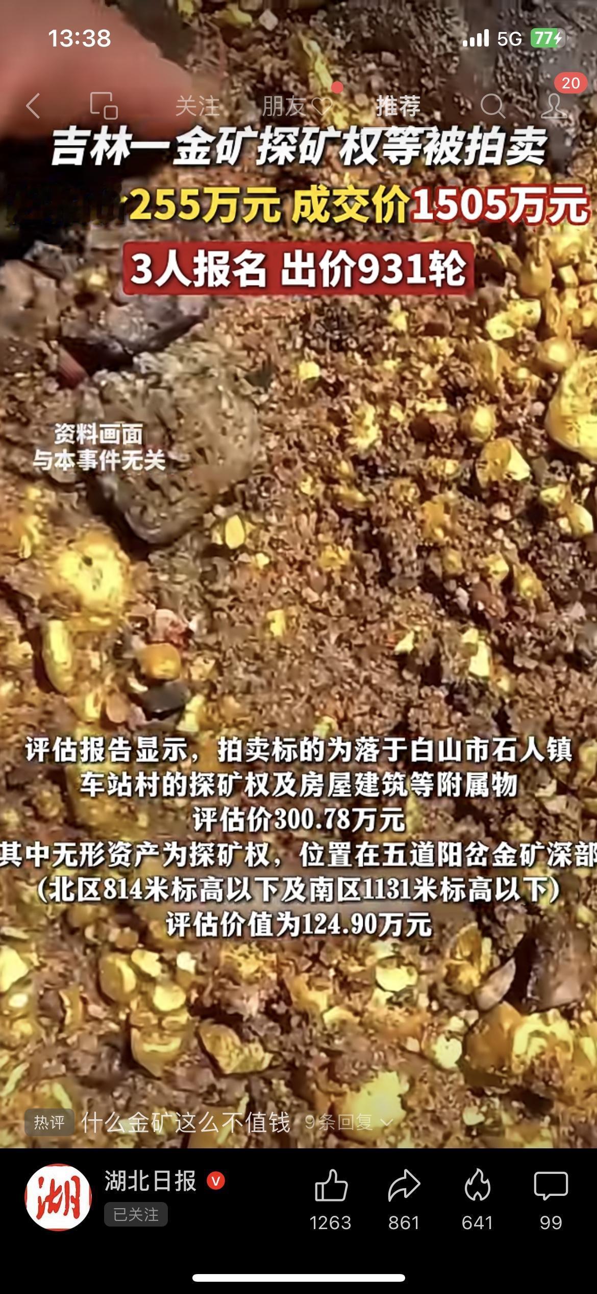 疯了!吉林一金矿探矿权拍卖,255万起拍竟拍到1505万,3人抢了931轮! 家人们快看这金矿拍卖有多疯狂!吉林江源一个金矿的探矿权及附属物,起拍价才255万,结果被拍到1505万,溢价率高达489%!3个人报名,整整出价931轮,其中还有922次延时出价,这抢矿跟抢白菜似的! 这探矿权位置在五道阳岔金矿深部,评估价才300多万,结果拍出这么高的价。固定资产包括金矿房屋、炸药库这些,评估价175万多。也不知道拍下的人是看中了金矿的潜力,还是觉得这矿有啥隐藏价值。 家人们,你们觉得这金矿到底值不值这个价?快在评论区聊聊!