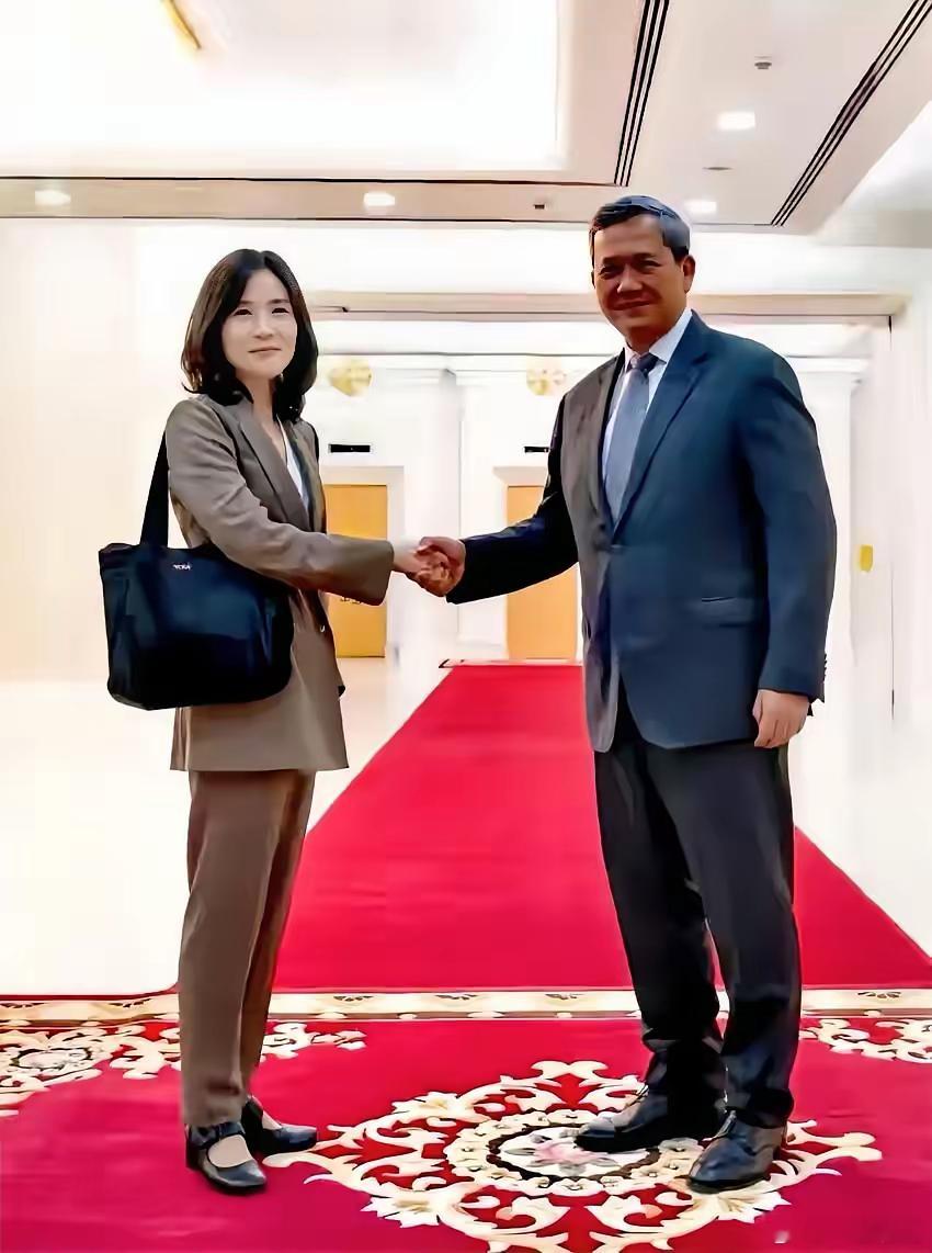 大韩民国在维护本国公民权益等方面的表现可圈可点,其政府和军队有担当、有魄力,爱民如子,值得点赞 。 图: 韩国外交部副部长金智娜和柬埔寨首相洪玛奈