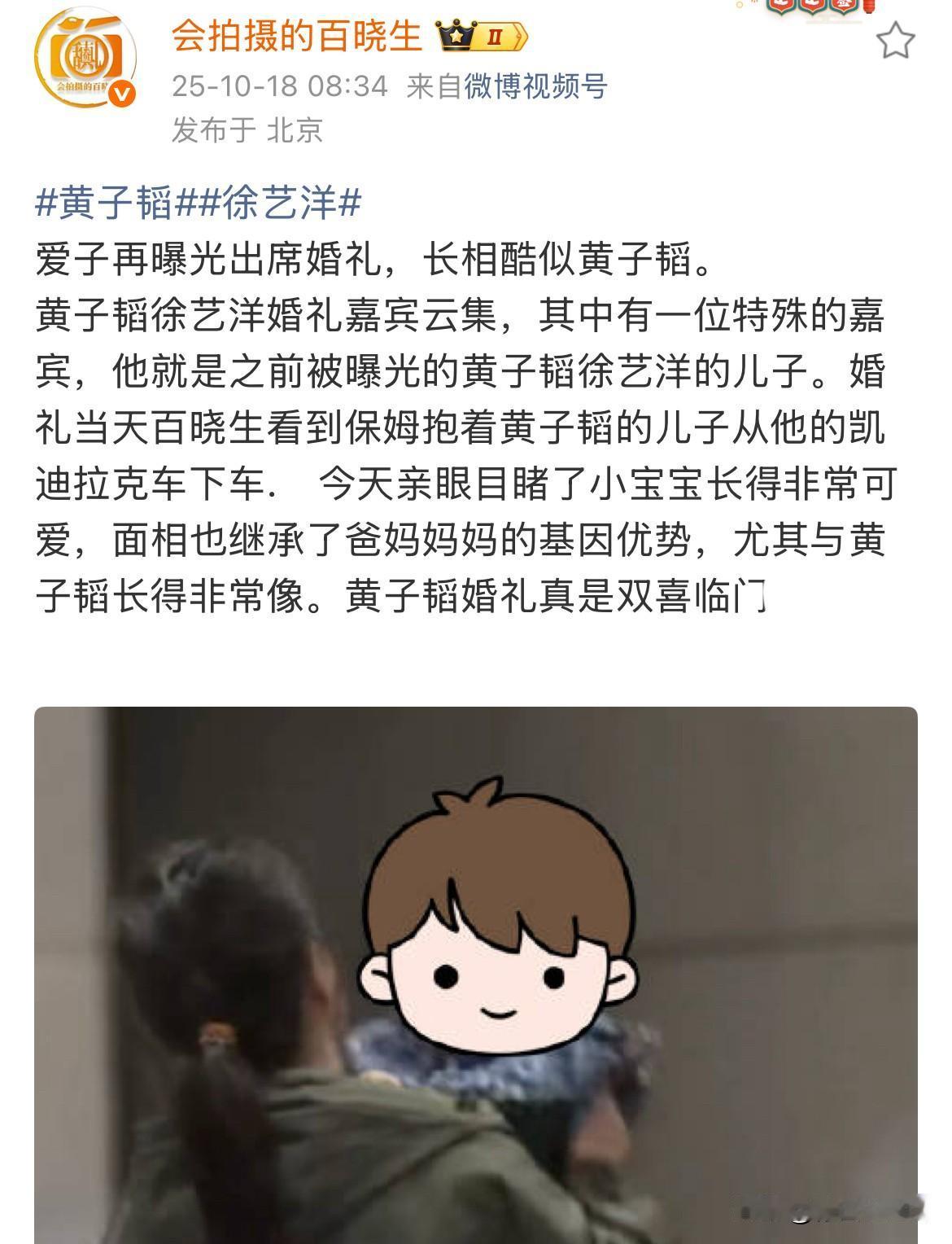 10月18日,狗仔拍到黄子韬儿子,连疑似都不用了,肯定的说是黄子韬徐艺洋的爱子,原因是这个孩子与黄子韬长得非常像,并且多次看到这个孩子乘坐黄子韬的车出行! 有一说一,如果黄子韬徐艺洋没有公开,就证明他们想保护他们的孩子不被打扰,那就没必要盯着孩子拍了,知道有这么个孩子,祝福就好!虽然黄子韬看上去不太靠谱,但在保护家人这方面还是很注意的! 现在的内娱全是喜事,相比乌烟瘴气好多了!