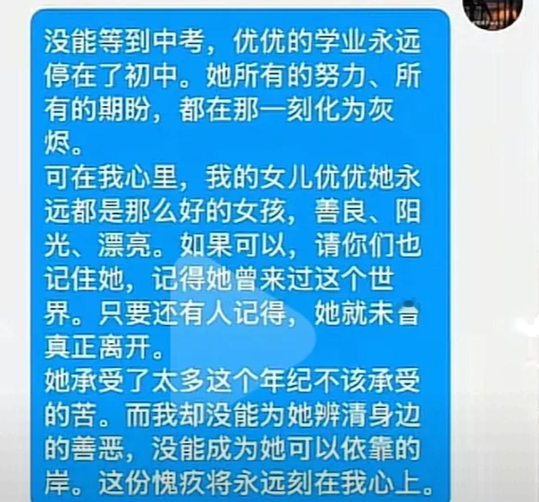 优优被捅伤后,是物业最先发现的情况!之后,罪犯钟建川母亲还假惺惺地在群里发信息,询问女生情况如何,说自己儿子为了救人两手腱都被割断了,但是凶手跑了! 也不知道是男生蒙骗了家长,还是家长一块撒谎帮他掩埋真相。但是不管怎么样,纸包不住火的,没多久警察就来把钟某带走了。 其实钟某选取的作案地点并不高明,就是在放学回小区后,等优优到了自己的那栋小区就动手了,可见他真的内心是恨透了优优。 短短十几秒捅了26刀,很多伤都在致命的位置,这分明就不想让人活啊。 而事发后钟某没有任何歉意,他们一家人也是默不作声。直到优优妈妈想上诉s刑时,他们才慌了跪下来求情。 我想他们应该是仗着未成年保护法,觉得儿子应该没太大的惩罚,最多做几年牢罢了。 等等到优优妈妈要求s刑时,他们才开始害怕,但是这并不代表着他们忏悔,只是在法律面前的恐惧而已。 看这个新闻,昨天我晚上特意跟闺女谈了一晚上交朋友准则。 原来我是告诉她,交朋友不要看成绩家庭,重要看人品。但是昨晚上我告诉她,交朋友也要讲究门当户对,大家实力相当才能相处得愉快。 她成绩好如果交个成绩倒数、家庭破裂的朋友,难保时间长了人家不会嫉妒她,嫉妒时间长了都会生坏心。 而且千万别被短剧小说洗脑了,整上救赎那一套,安安稳稳过自己日子才是最重要的。