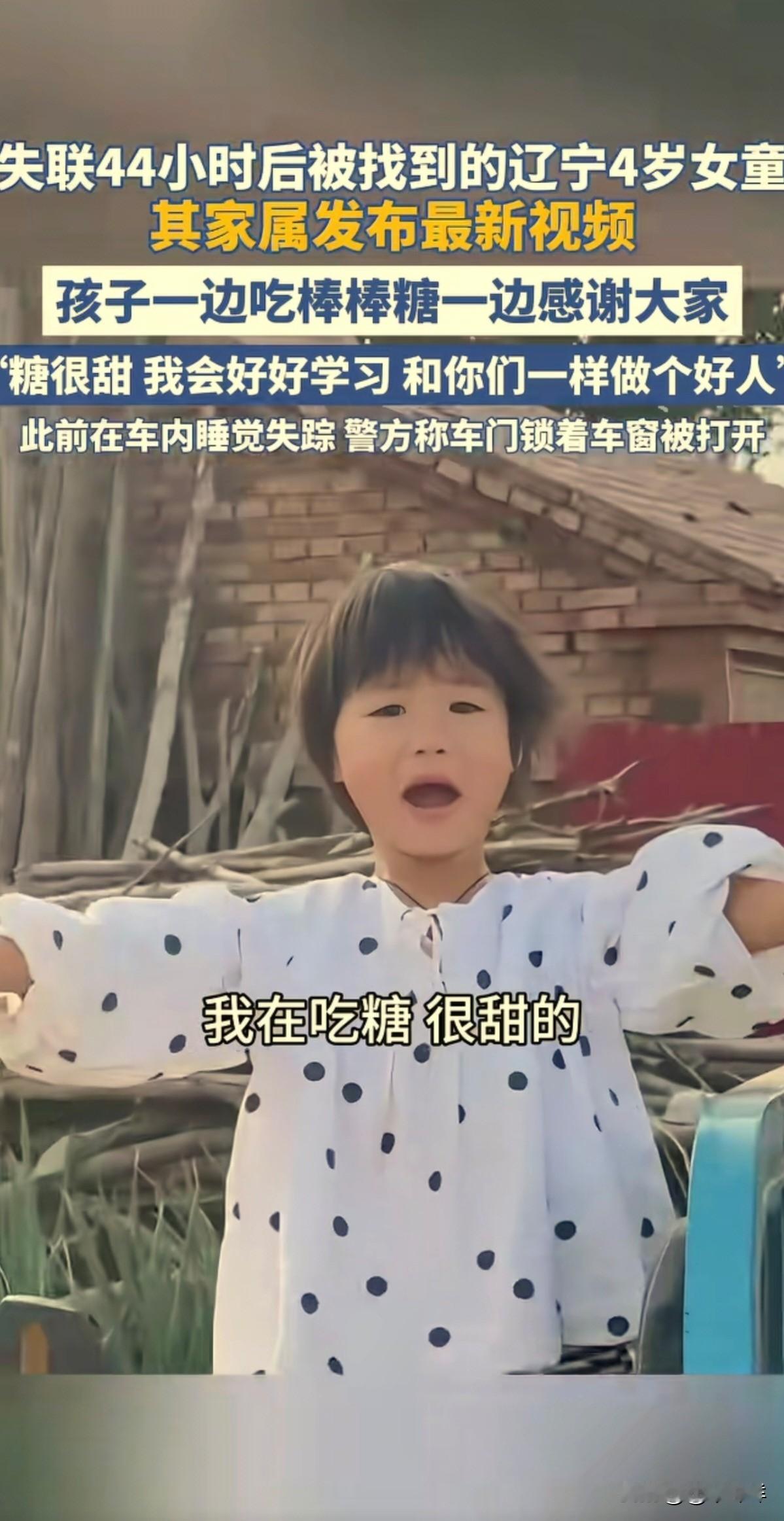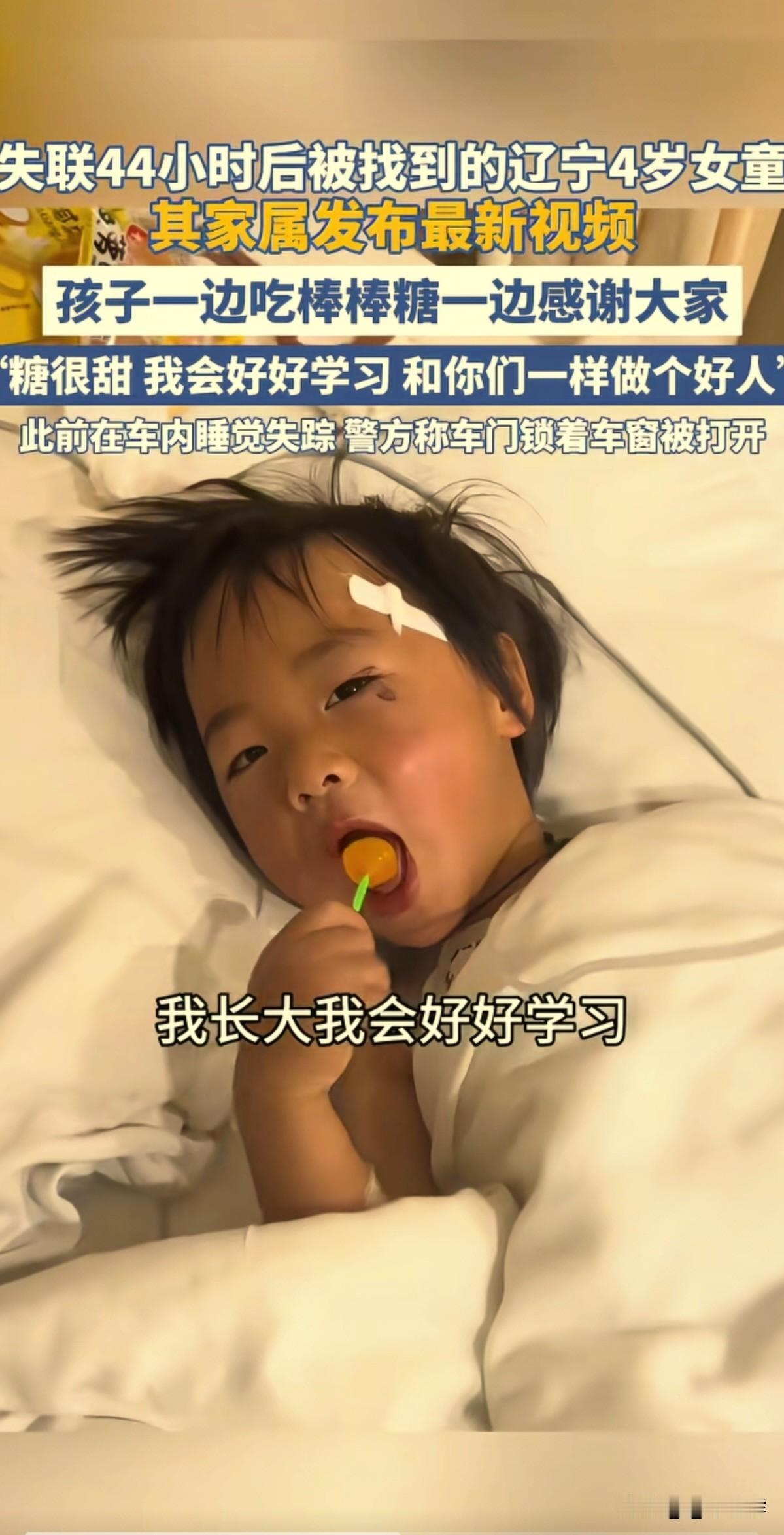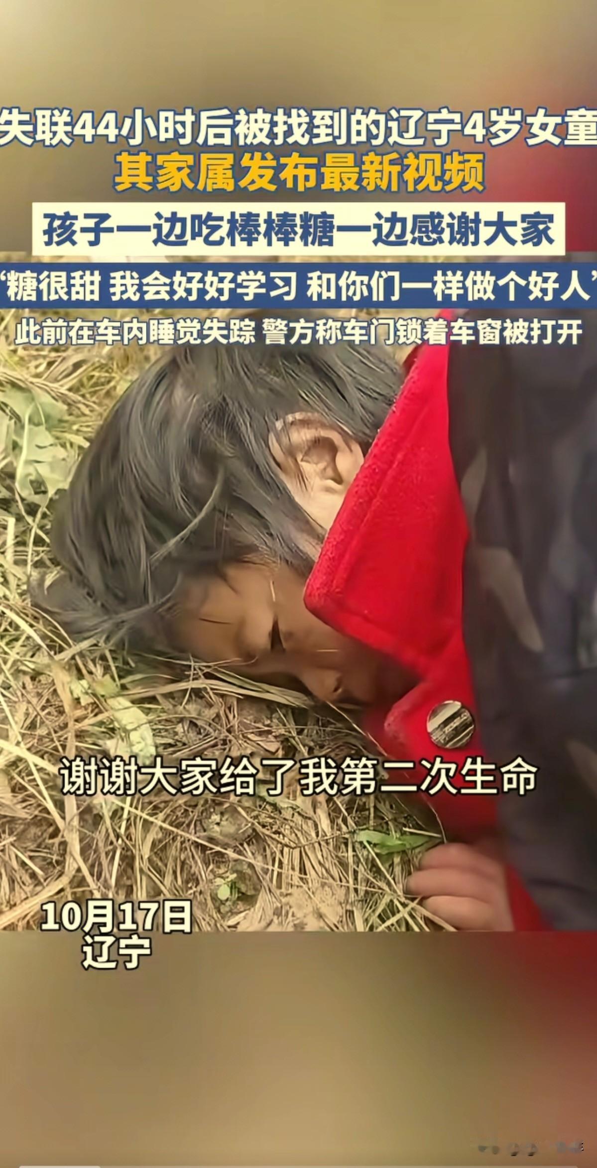 真是好消息! 辽宁走失4岁小姑娘找到了!没有大碍,生命体征平稳! 小姑娘失踪44小时,警方组织12000余人寻找,幸运的是,小姑娘找到了,小姑娘挺聪明的,蜷缩在山地的草窝里,既保暖又能躲雨。警察找到的时候,意识挺清醒的,问她是不是遇见人贩子把她抱走了,小女孩奶声奶气地说:“是睡醒后下车找奶奶迷路了!” 真的难以想象这小姑娘是怎么坚持下来的,别忘了她才4岁呢?独自在野外生存了44小时,真是太幸运了,小姑娘也是有福报的。大难不死,必有后福! 小女孩找到被送去医院,吃着棒棒糖感谢大家:“谢谢大家给了我第二次生命,我长大后会好好学习,也和你们一样做个好人,我爱你们!”真是个懂得感恩的小家伙,看出来小女孩的家教是不错的! 孩子找回来是一件幸运的事情,但是照顾小姑娘的家长实在太粗心了,照顾小孩是一份责任,容不得半点粗心和马虎!给大家提个醒,家里有小孩的家长,千万要注意! 愿善良和爱得以传递!