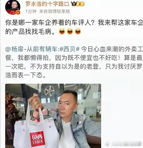 你是哪一家车企养着的车评人万万想不到,不知道是不是冒充的车评家,一次黑两个以为是假的。没有想到,本尊在吓得删除,吓得删除前,还有一条回怼网友:难道不喜欢西贝也不喜欢罗永浩就犯天条了?