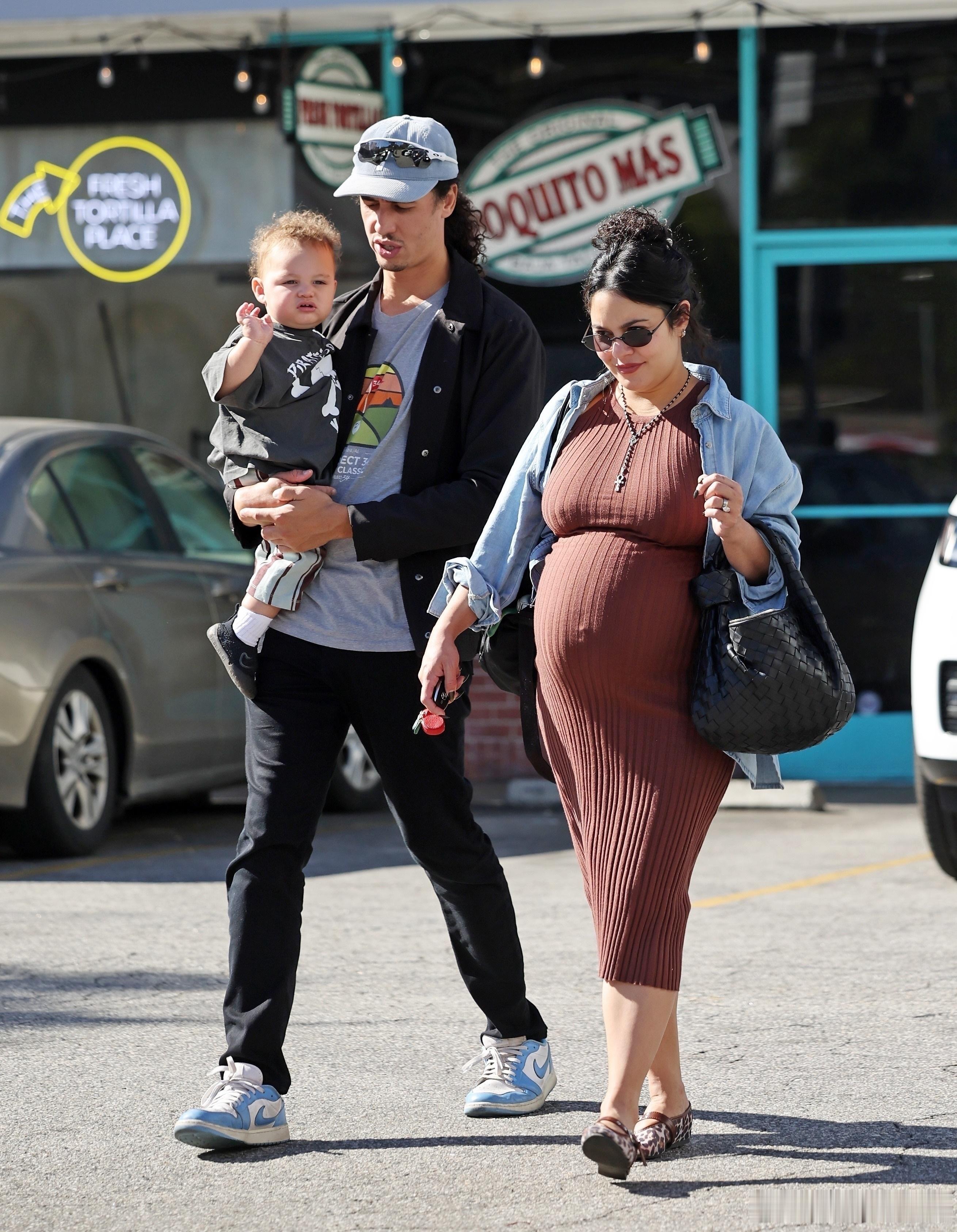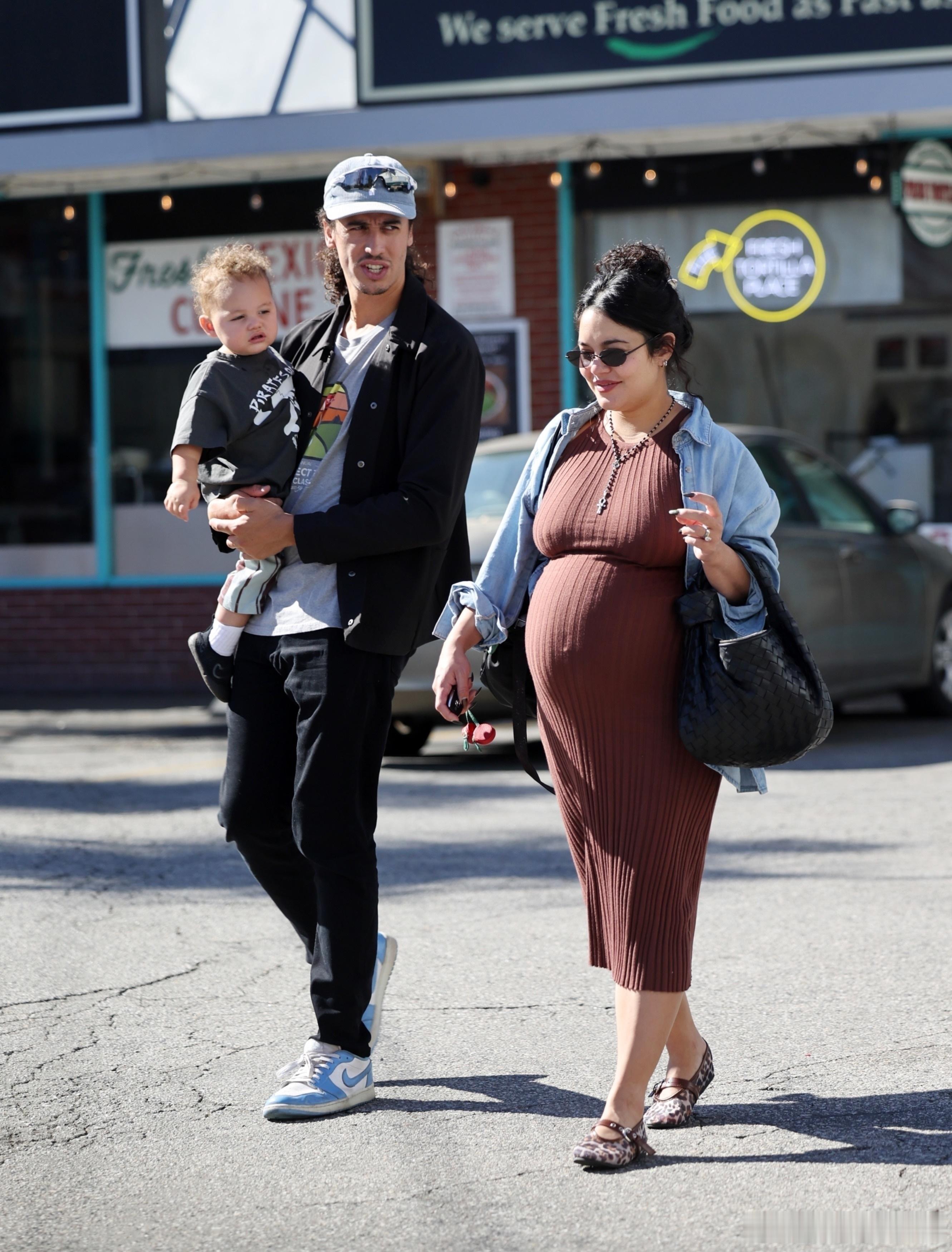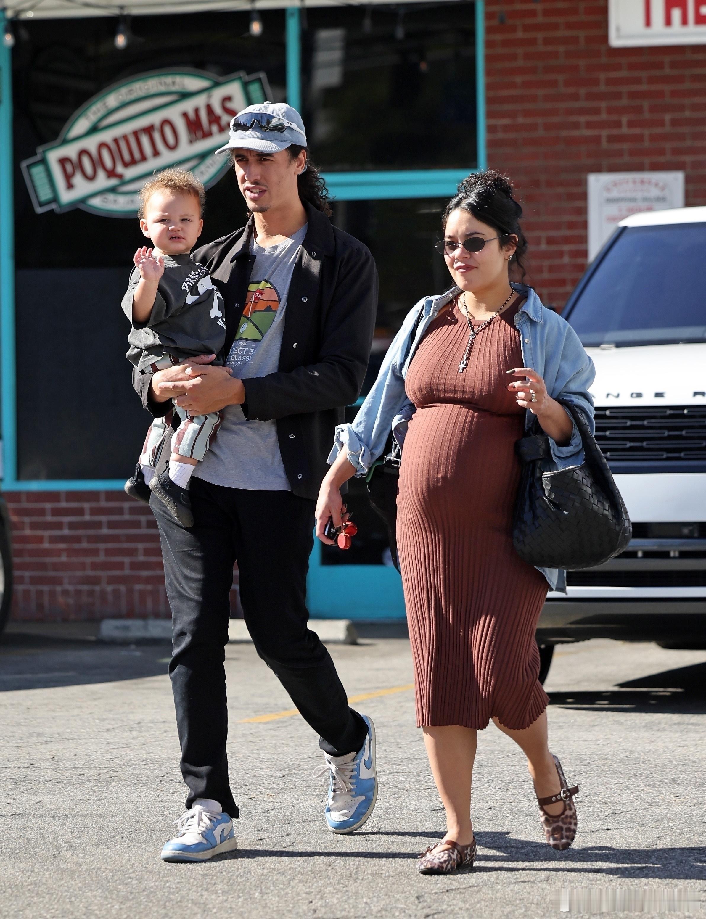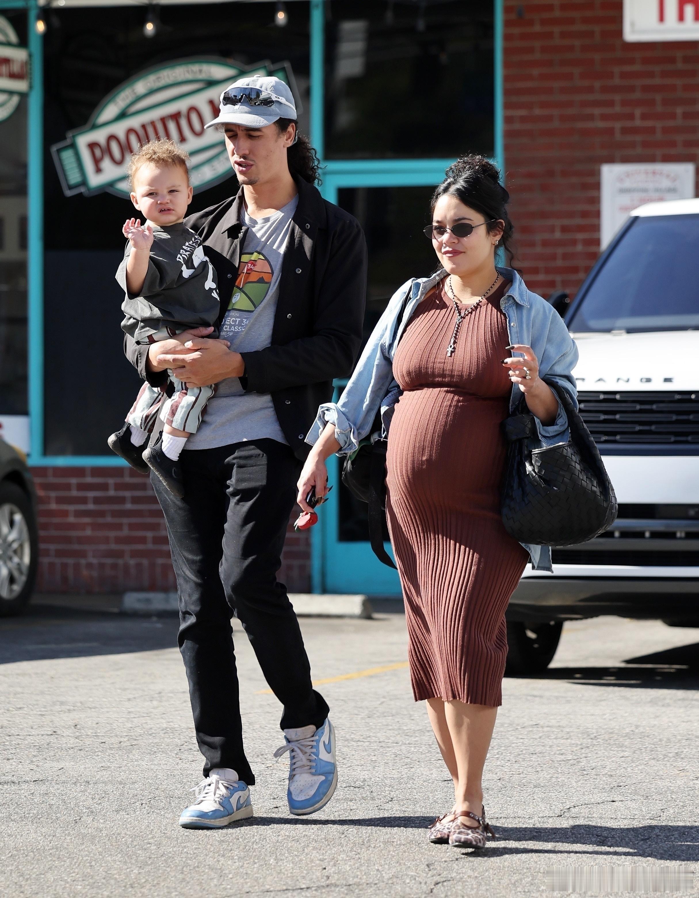 Vanessa Hudgens凡妮莎哈金斯挺着二胎的孕肚和老公Cole Tucker带着儿子在洛杉矶外出,一家三口就餐后离开一餐厅