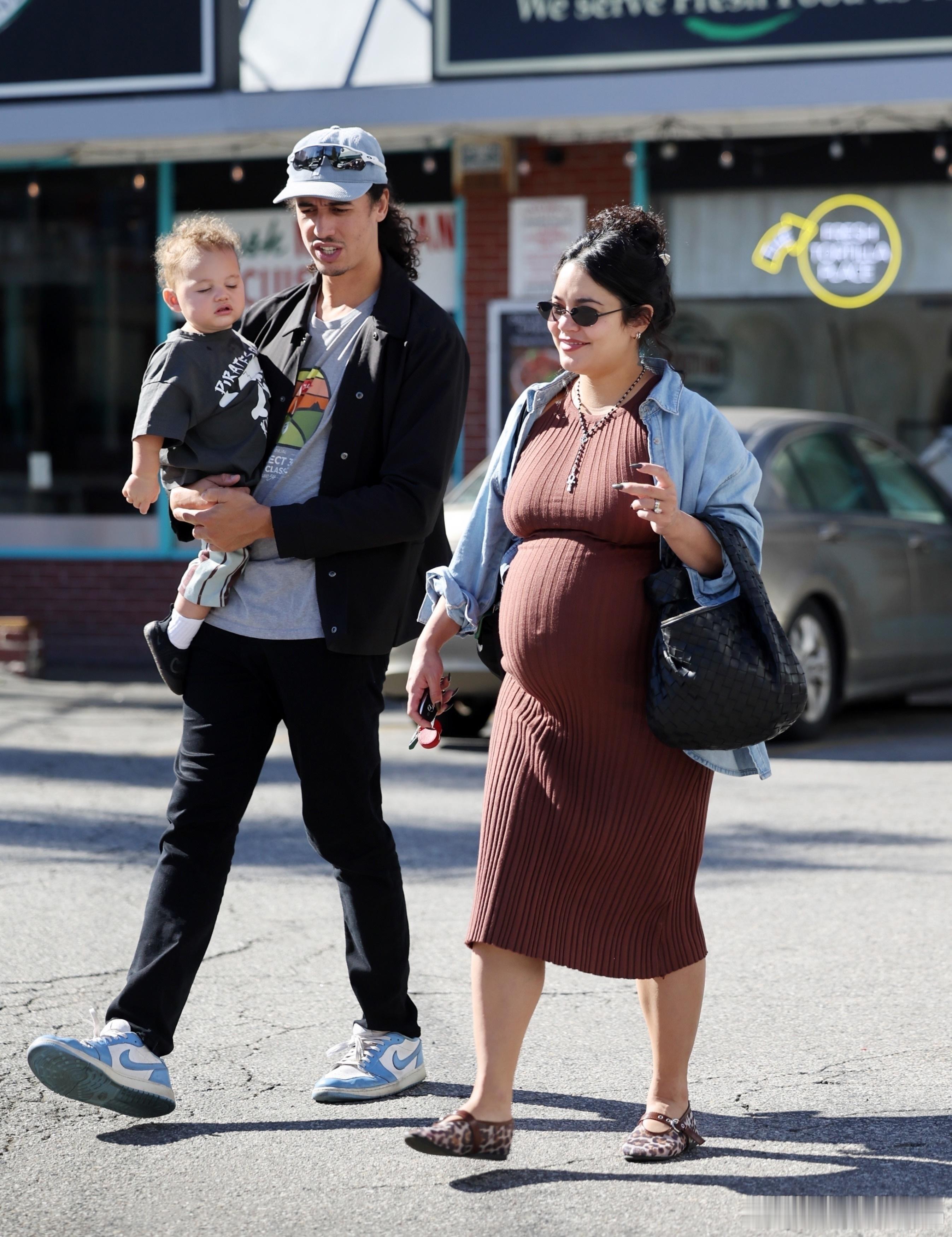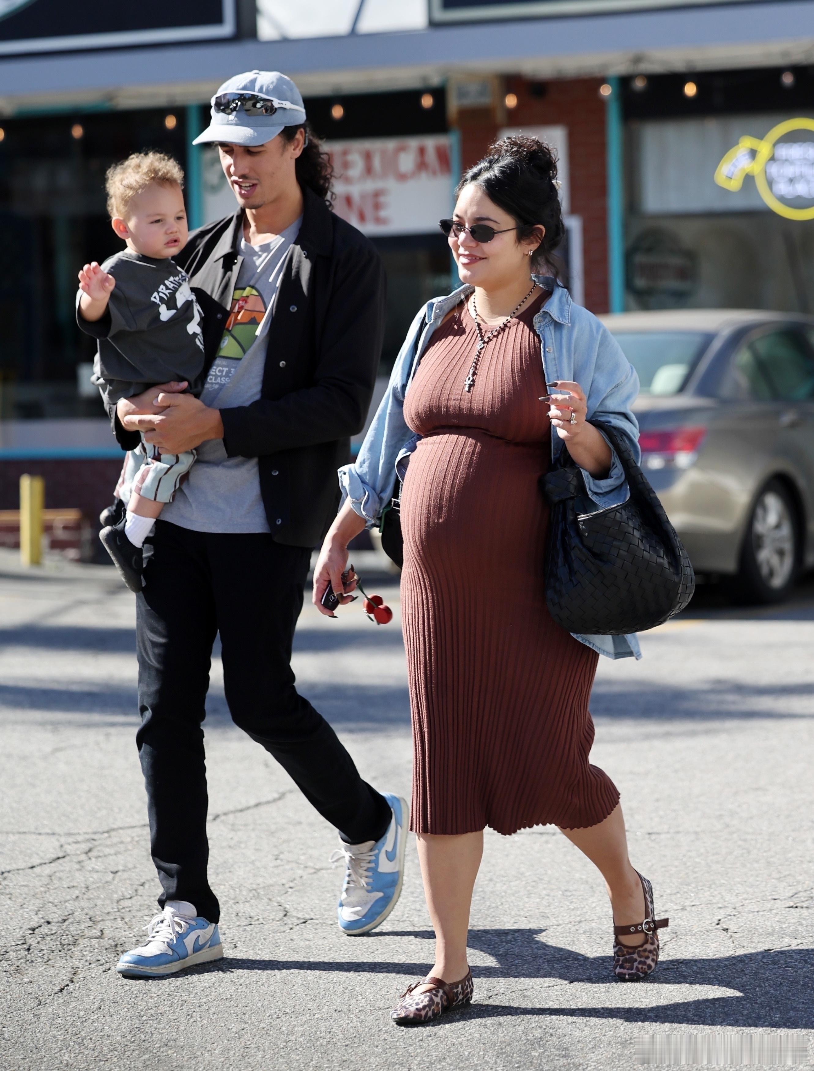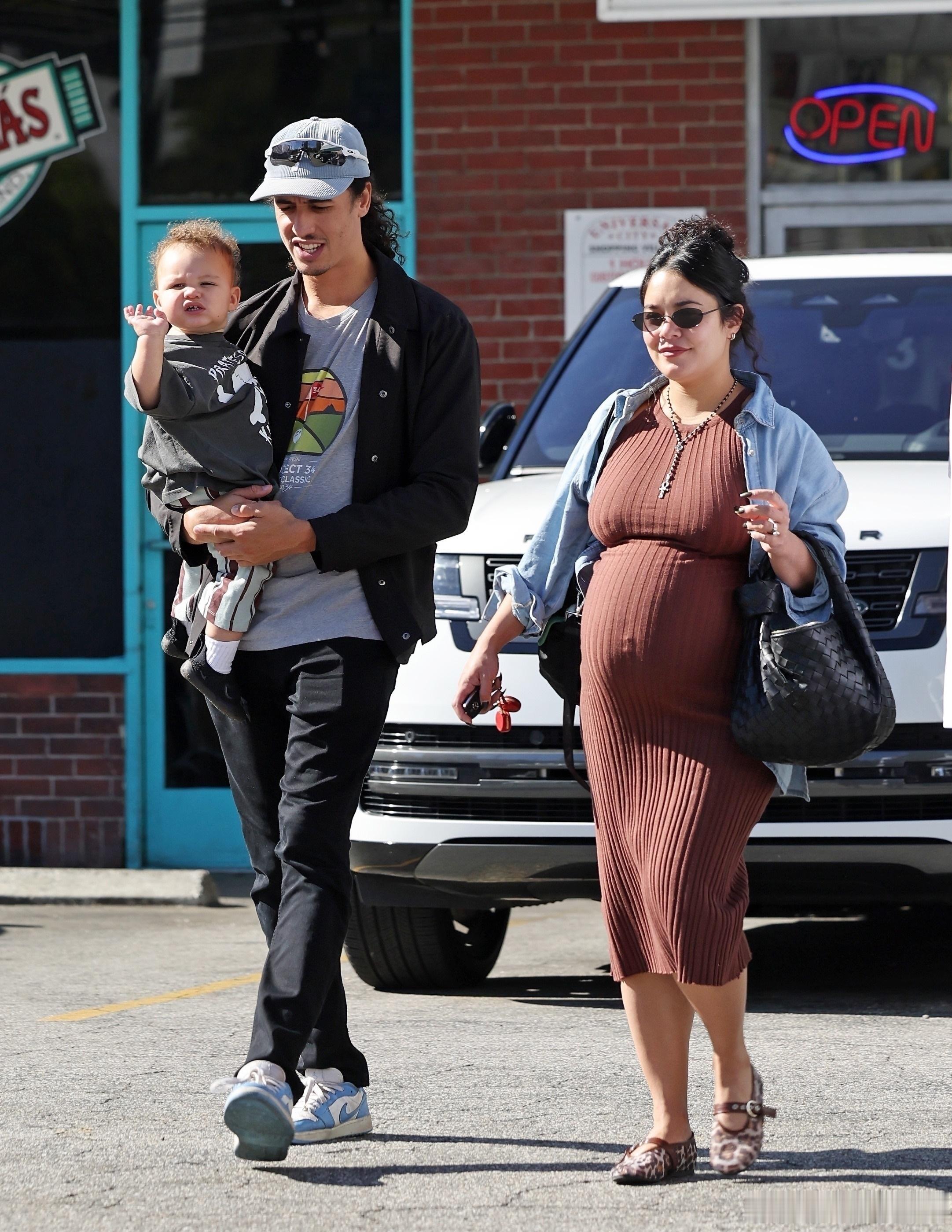 Vanessa Hudgens凡妮莎哈金斯挺着二胎的孕肚和老公Cole Tucker带着儿子在洛杉矶外出,一家三口就餐后离开一餐厅
