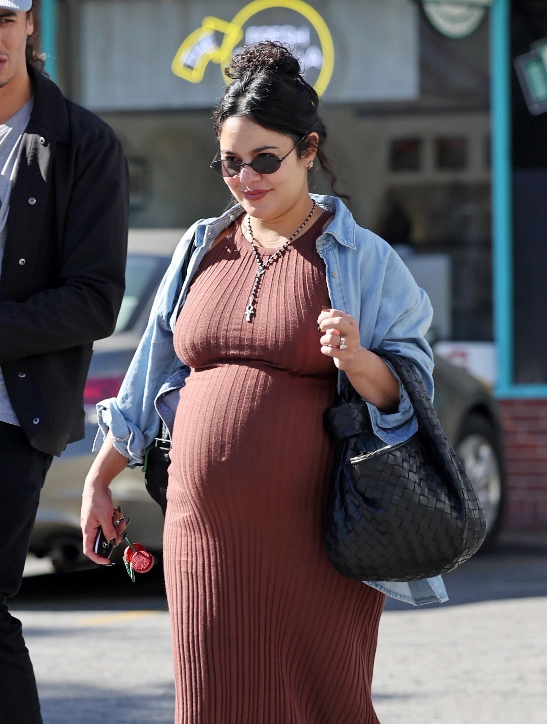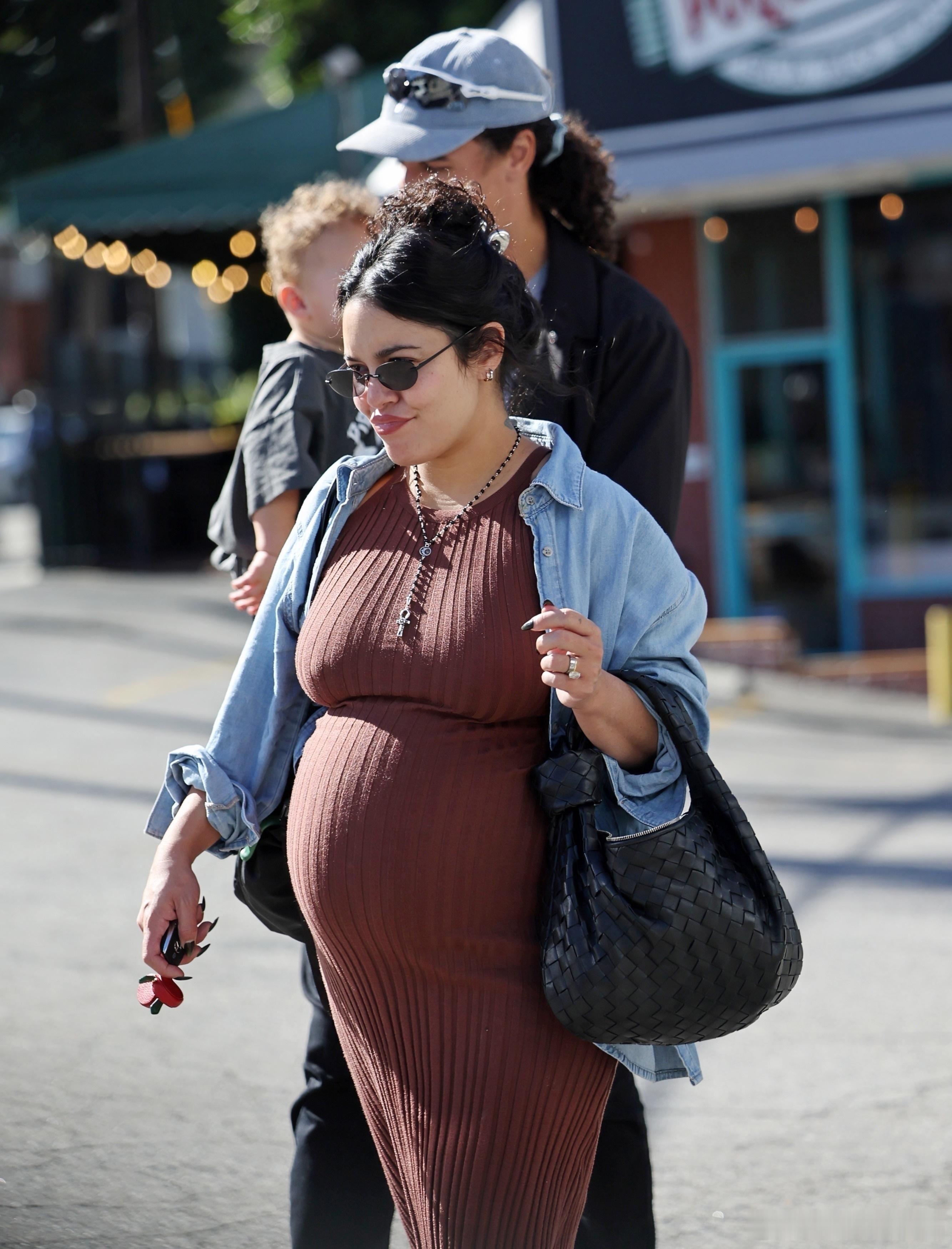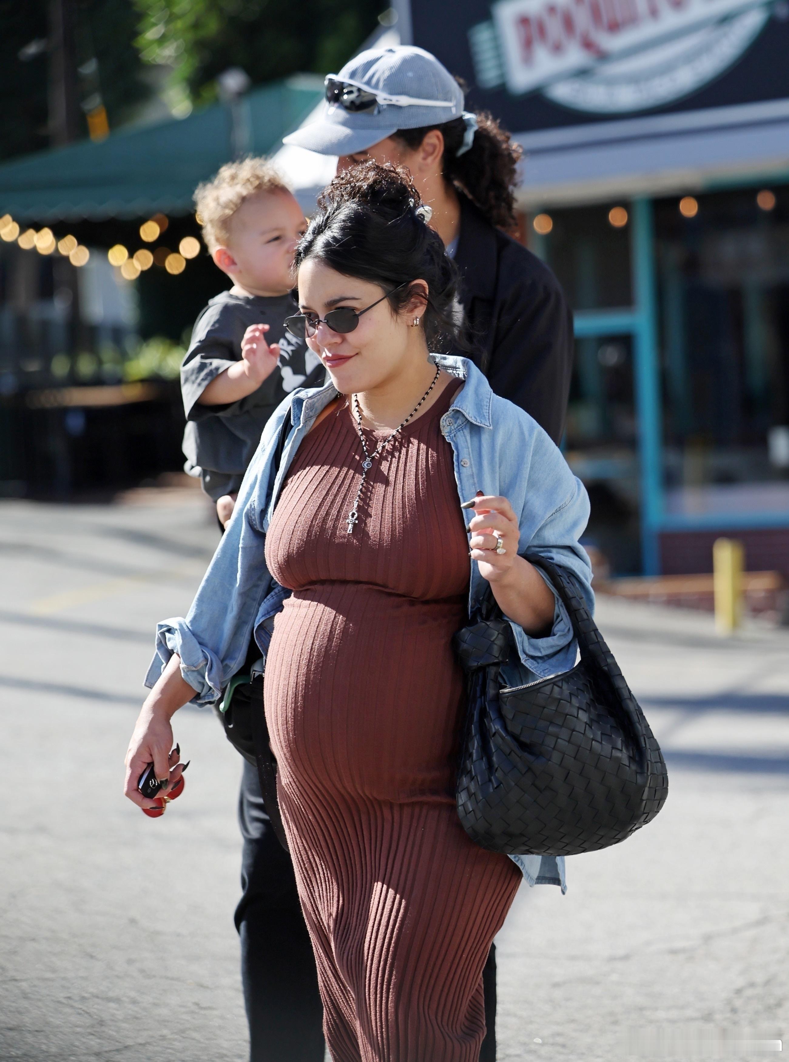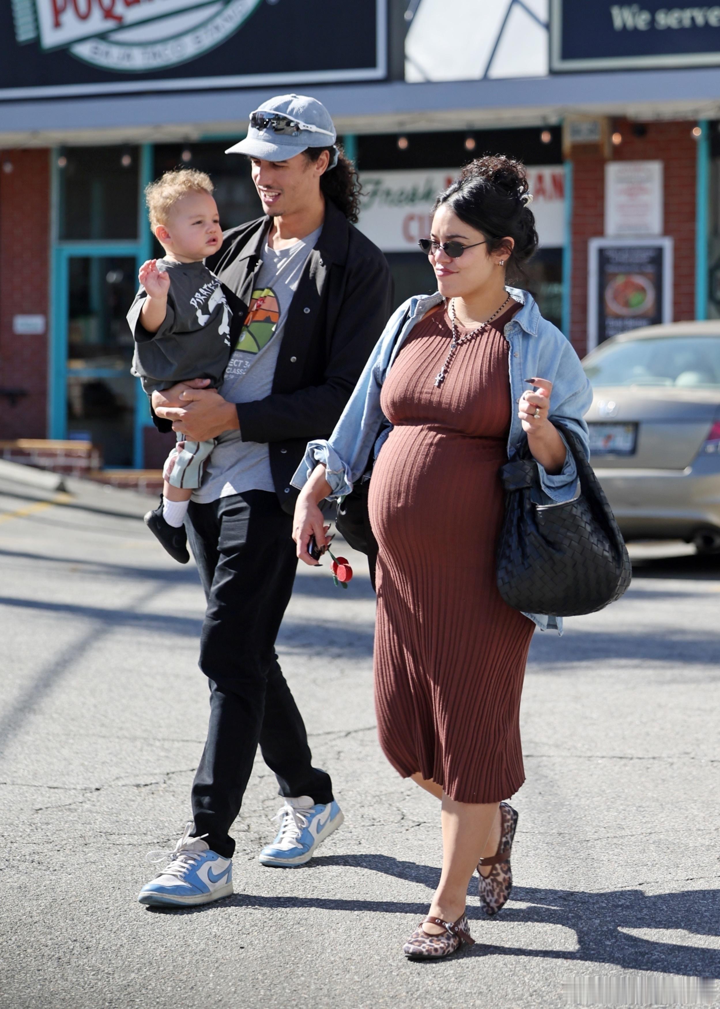 Vanessa Hudgens凡妮莎哈金斯挺着二胎的孕肚和老公Cole Tucker带着儿子在洛杉矶外出,一家三口就餐后离开一餐厅