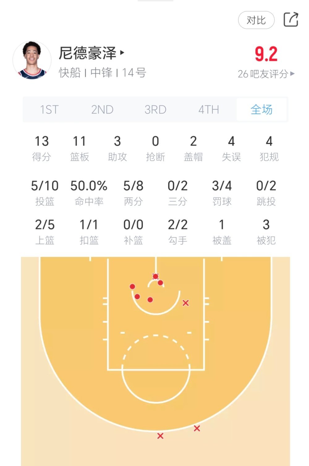 尼德豪泽今日表现!抢下7个进攻篮板!