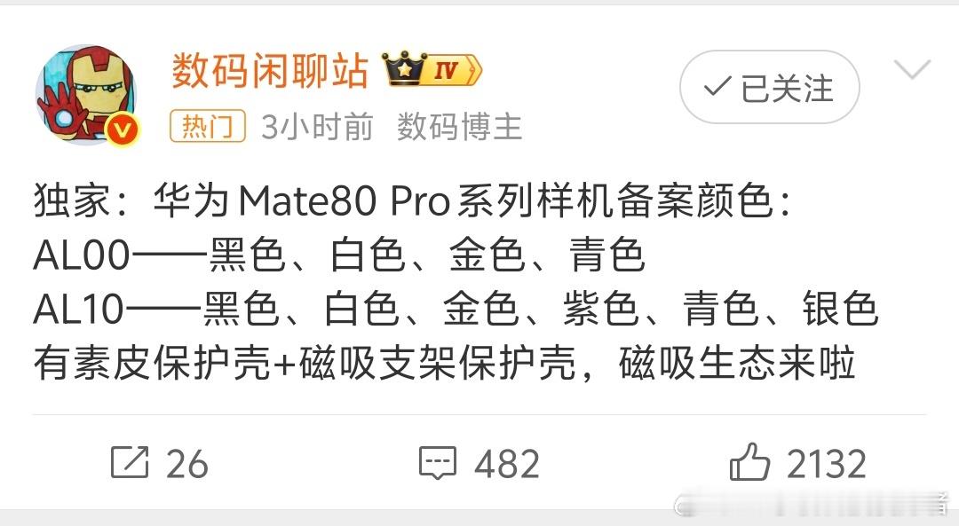 华为Mate80Pro备案颜色曝光华为Mate80系列距离上市也不远了,这次新机颜色挺多的。我一直都挺喜欢Mate系列的设计风格,不知道这次硬件升级大不大。