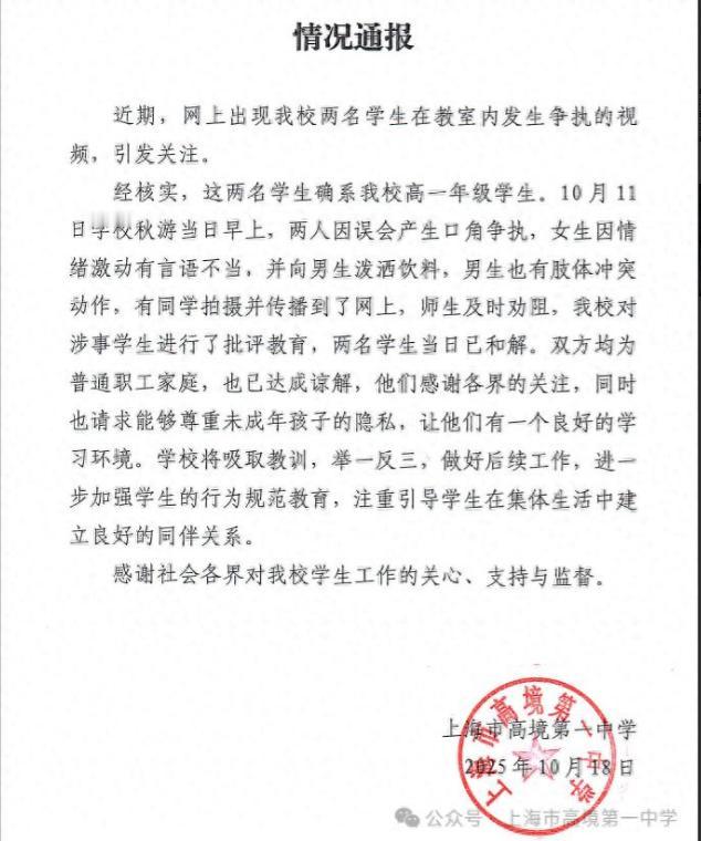 上海拿饮料泼男同学的女生,她爸到底是干什么的?可能永远是个谜!知道用“分数”论资排辈,用身份“打压”对方,这姑娘很是飚啊! 前几天,这段视频出现在网络上的时候,许多网友的肾上腺激素飙升! 因为大家似乎又看到了“我爸是李刚”的升级版即将出炉……要知道,当年因为这场儿子坑老子的大戏,那是掀起了腥风血雨啊! 至此以后,“李刚”便不是一个人的老爸,而是所有官二代老爸的“代名词”! 上海宝山区高境一中的这件事,感觉视频有些掐头去尾,大概就是:一个女同学正在劈头盖脸的教训另一个男同学! 感觉这姑娘教训辱骂人还挺有章法的,大概分以下这 几步走: 首先,女生鄙视男生的中考入学分数,说比自己低三十几分; 第二,女生预测男生的高考分数,肯定比自己三百多分(多加一个零); 第三,女生已经咬死男生考不起大学本科,只能是个大专生,没有资格和自己说话; 最后,女生抛出了“王炸”,仿效“我爸是李刚”的句式,吼出了“你知道我爸是干什么的吗”。 姑娘真是厉害啊,所谓的杀人诛心! 也不过就这一步骤嘛,把一个男生贬的一文不值,最后成功激怒对方,遭到男生一个“霹雳掌”! 事情的起因据说是10月11日高一年级秋游,这俩学生闹了些口角,继而发生争吵,有同学拍摄了视频上传到网上…… 10月17日,高境一中公布了对这件事的处理结果:女生因为辱骂和挑衅他人被处分,男生因为动了手被批评。 然而,通篇的处理结果中没有提到女生的父亲,只是轻描淡写的说“都是普通家庭”! 看完通报,不少网友有些意犹未尽了:姑娘哎,你爸到底是干什么的?我们很想知道啊,怎么视频里你就忍住没吼出来呢? 透过现象看本质,这件事能说明些什么问题? 1、才高一的年纪,学生已经开始“唯分数论资排辈”! 这女孩因为中考分数高,就觉得处处高人一等,小小年纪就开始用分数彰显地位,这难道是娘胎里带来的?当然不可能!一定是在整个学习环境中都充斥着这种功利化的氛围,学生才会有样学样! 2、学校不提她爸是谁,难道她爸就真的不是那谁了吗? 与人争论的关键时刻,女生骄傲的喊出了“我爸是谁”的口号!这不可能是临时起意,一定是长期养成的心理优势! 一个普通家庭的孩子,在和同学发生矛盾的时候,大概率是喊不出这样的话的,因为没“练”过,台词不熟啊! 3、女生辱骂挑衅男生时无人阻止,男生冲过来推搡,一群人上来劝架! 这个小细节看在笔者眼里,真是叹了无数遍的气啊…… 看来,这些孩子们也是知道见人下菜碟的,知道在暴风雨来临之时,如何让自己身处安全区!他们或许知道冲突双方力量悬殊,这才做出了自己漠视的选择。 最后我想了想,这是不是“校园霸凌”呢?尽管女生之上用言语挑衅,“轻轻的”浇了一杯饮料在男同学身上! 还是那句话,杀人诛心,才是最高深的功力! 霸凌不一定是拳打脚踢,不一定非要把人揍得鼻青脸肿。相反,用“唯分数论”打击他的自尊心,用“身份论”毁灭他的自信心,这才是最黑暗的霸凌……