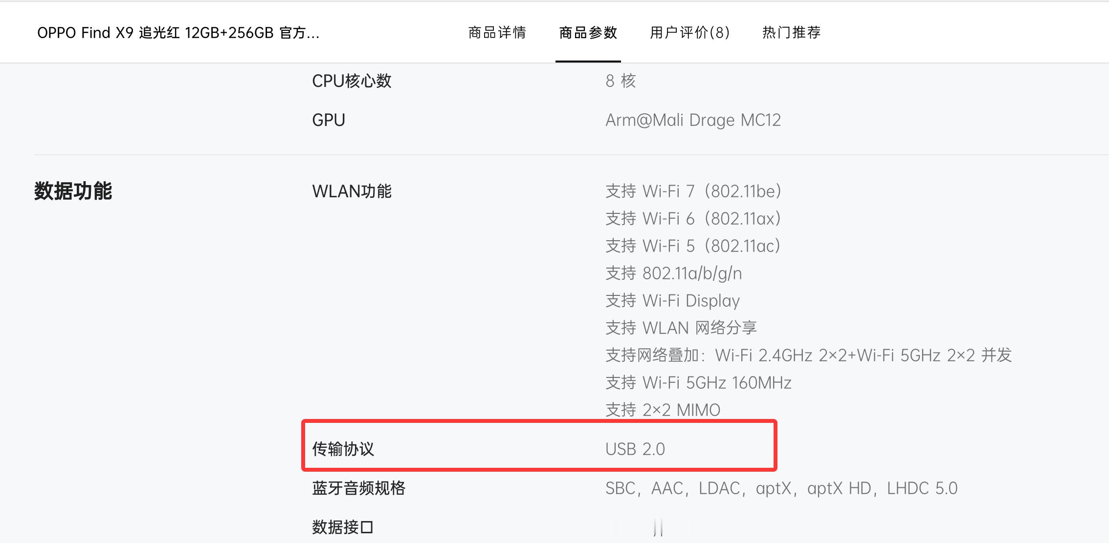 听说OPPO Find X9用的传输协议还是USB 2.0,刚看了下官网,确实如此。而同为4399起的vivo X300,却是全系USB 3.2 Gen1,果然发布会没吹的就是阉割的[允悲]