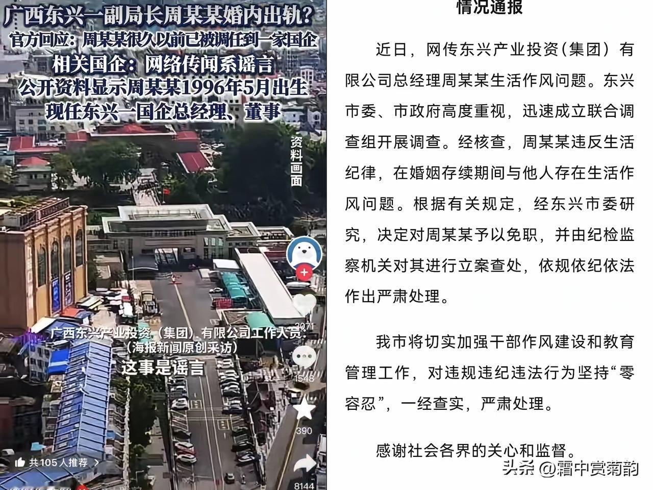 广西防城港东兴市产投公司的周某出轨事件,在东兴本地广泛传播,十几天流言压不住了,官方才承认此事。 可笑的是,此事件发生后,该公司还一度派人到澎湃新闻并请求澎湃新闻进行“澄清”, 没想到十几天后,随着事件的不断发酵,周某的出轨一方竟然向官方承认此事,此事的另一方还发视频称“原配”逼她“下跪认错”,让官方颜面扫地,没想到该公司如此处理危机,让防城港再度蒙羞! 对此,大家怎么看呢