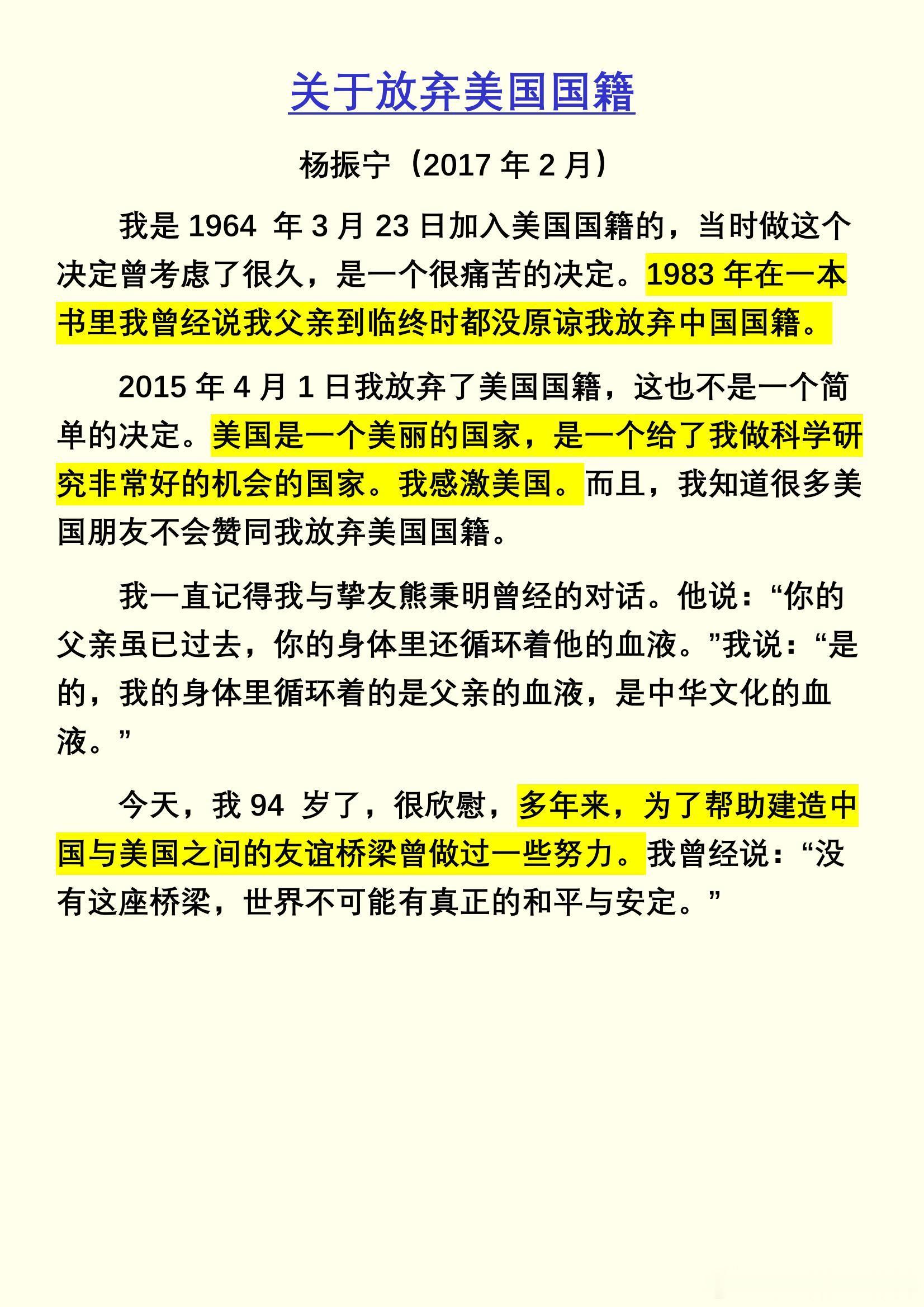 杨振宁逝世《关于放弃美国国籍》杨振宁!