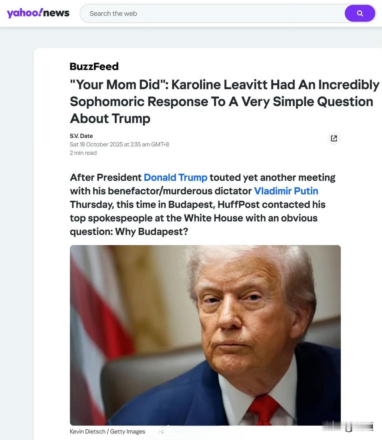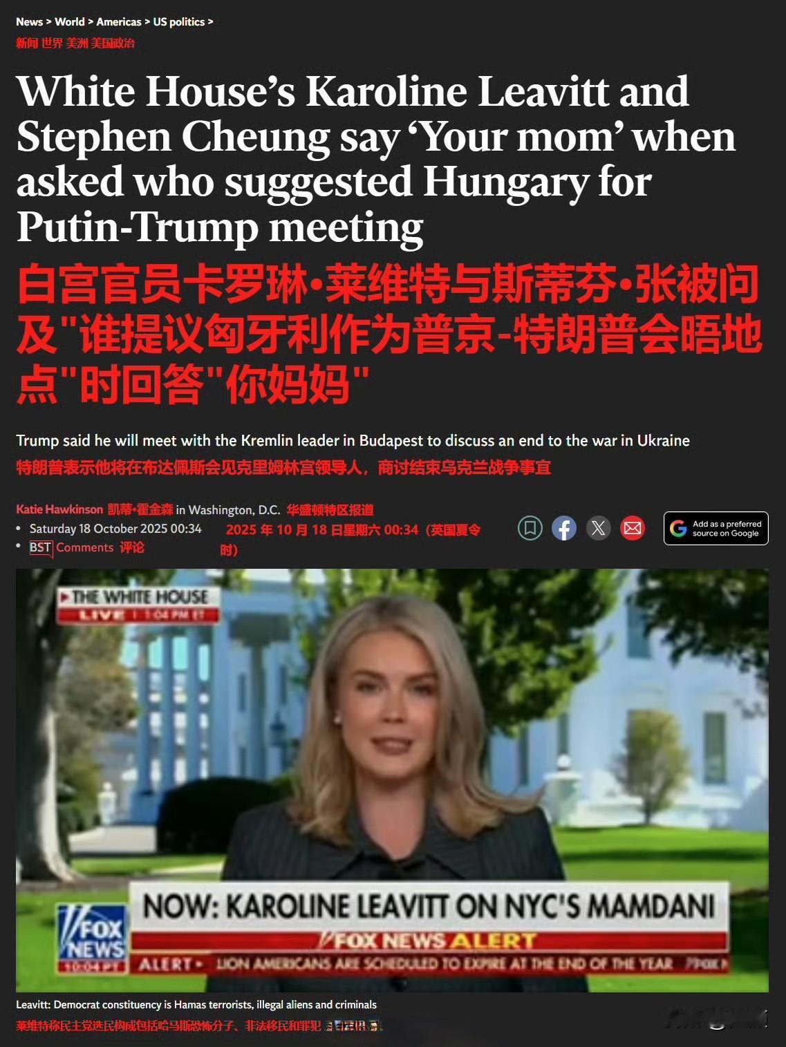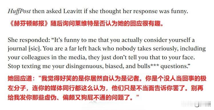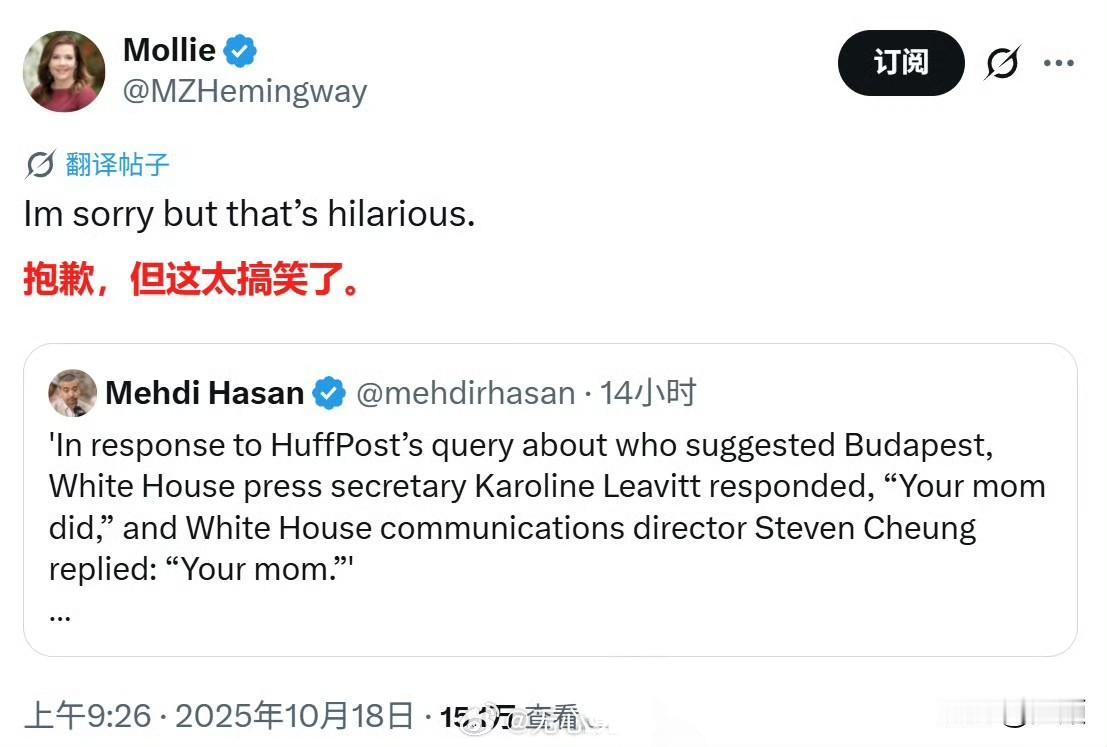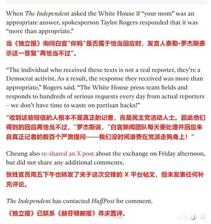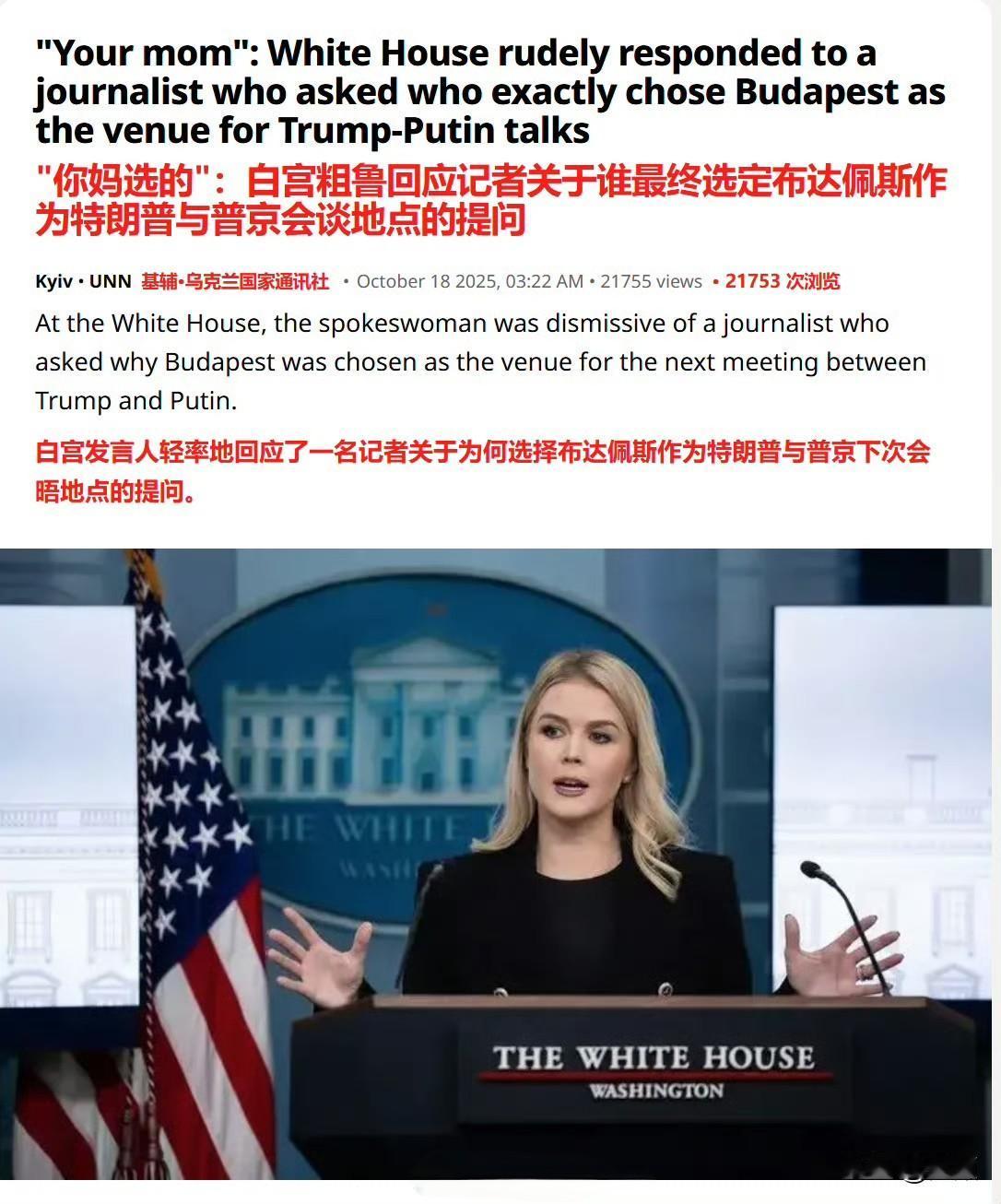 直接用“你妈”(your mom)回应,这事是真的…… 特朗普宣布将与普京在布达佩斯举行会晤后,《赫芬顿邮报》提问“是谁选了布达佩斯”,白宫新闻秘书卡罗琳·莱维特以不礼貌的言辞回应称“你妈选的”,随后白宫通讯主任史蒂文·张也补充道“你妈” 。 《赫芬顿邮报》称对这场交锋感到“崩溃”,并表示“不敢”再向白宫提任何问题。 社交媒体上对此事的反应因党派立场差异巨大。 自由派人士认为莱维特和张的回应并不好笑。 而保守派人士盛赞总统团队对左翼媒体的戏弄。 目前尚未看到白宫方面对这一事件的进一步官方解释或说明,也不清楚这种回应是个别官员的即兴之举,还是反映了白宫内部对待媒体的某种特定态度。