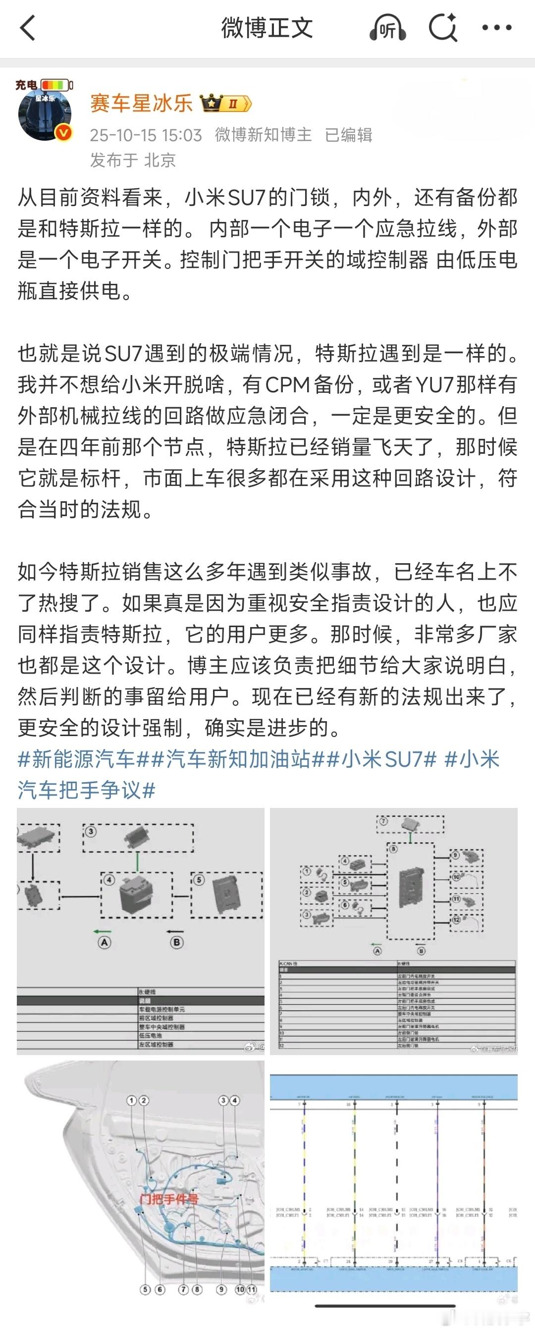 小米SU7 前一阵车祸,似乎很多人都在关注“电子门把手”,但是其实这是个行业现象。2014 年起特斯拉大火的时候,全系就采用“外开电释放+内开机械冗余”方案,国内销售了 300 万台;极氪、小鹏、凯迪拉克、福特等都采用过这种结构。其实机械把手在剧烈撞击变形后也一样卡死,国标上已起草“内外双机械备份”,建议未来所有品牌都要升级。对于这起事故,最应该提醒我们的是不超速、不酒驾,才是给逃生留出生机的首要前提。你的车有机械门把手吗
