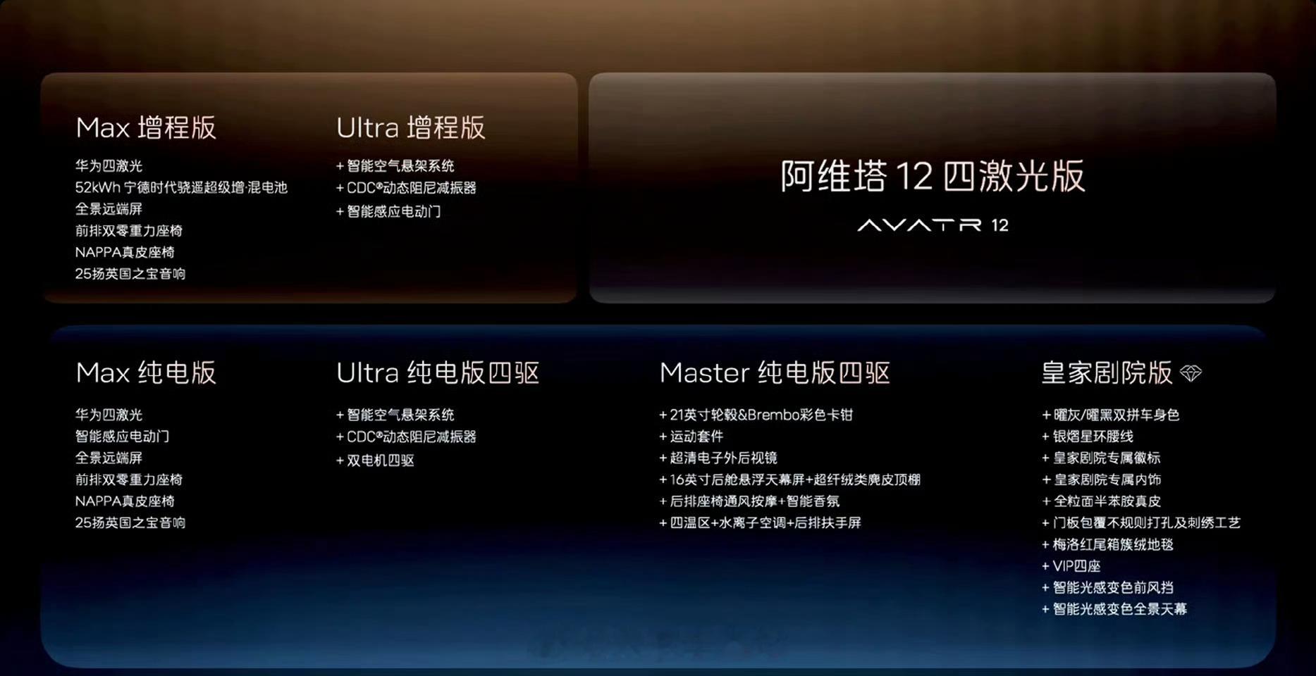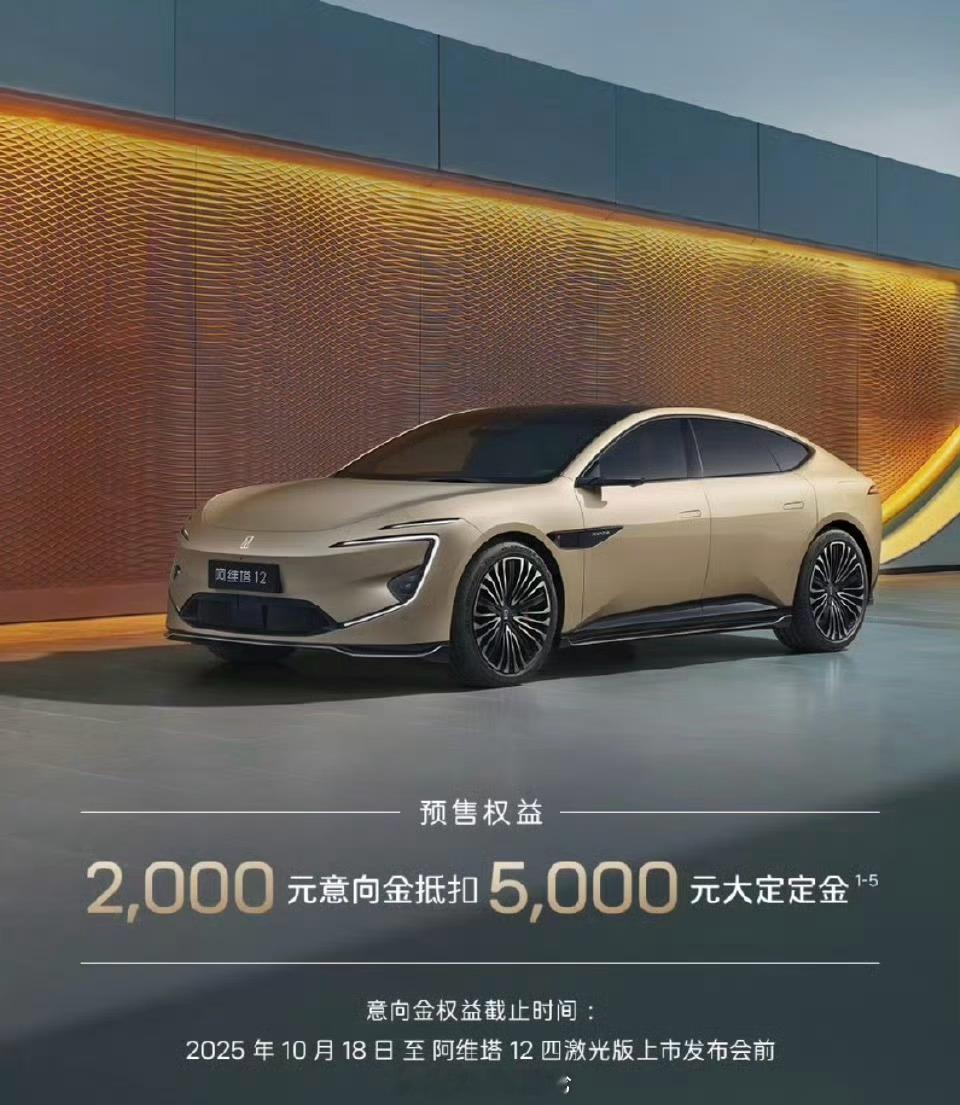 阿维塔12四激光版开启预售,将提供纯电与增程双动力,6款车型。即日起下订2000抵5000,并将于10月28日上市。