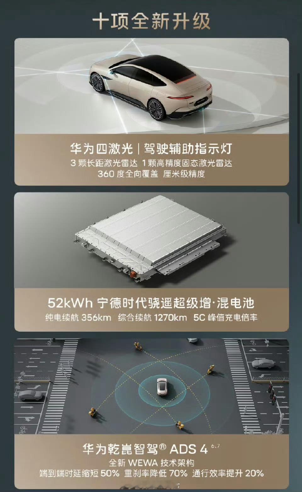 全系标配华为四激光雷达系统,华为乾崑ADS 4 + 鸿蒙座舱HarmonySpace 5;增程版升级52kWh宁德时代骁遥增混电池,CLTC纯电续航356km,综合续航突破1270km,5C快充10分钟就能补能30%-80%。