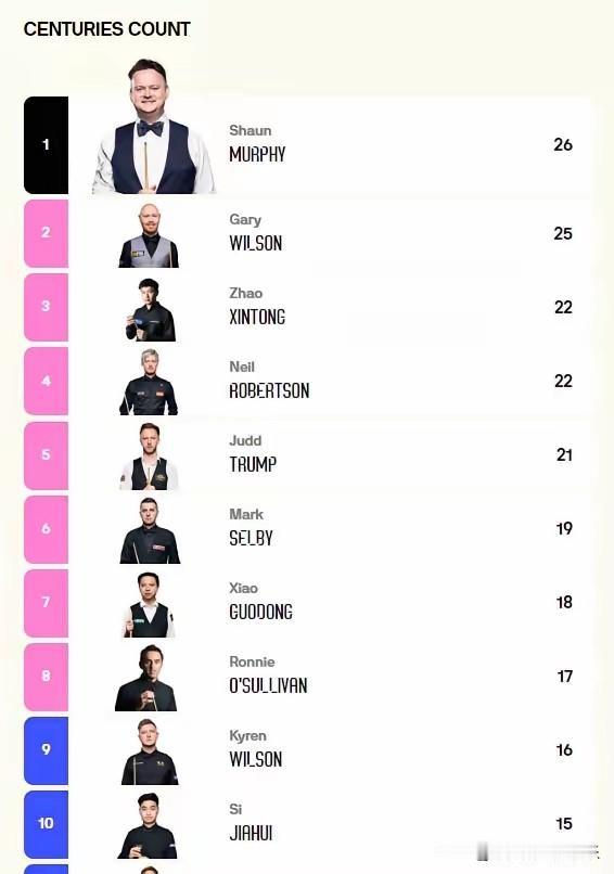 看出什么没有?赵心童、特鲁姆普独一档! 斯诺克新赛季破百榜怎么变,小特、心童都位居前列,其余选手都是依靠战绩飘忽不定。 肖国栋夺冠时刻冲上去,墨菲一冠一亚登上榜首,这还是两位成绩太差的缘故,要是特鲁姆普或者赵心童任一人恢复状态,又会成为一个人的榜单。 好在这两位攻击力最强选手都在低谷,我判断一下,英锦赛后赵心童、特鲁姆普必有一人登顶。 唯一能阻止他们的就是状态继续低迷,一个人可能,两个人同时并且长期都是,我是不怎么相信的。 希望特鲁姆普、赵心童这两位攻击型球员早日恢复,也让斯诺克多点吸引力。