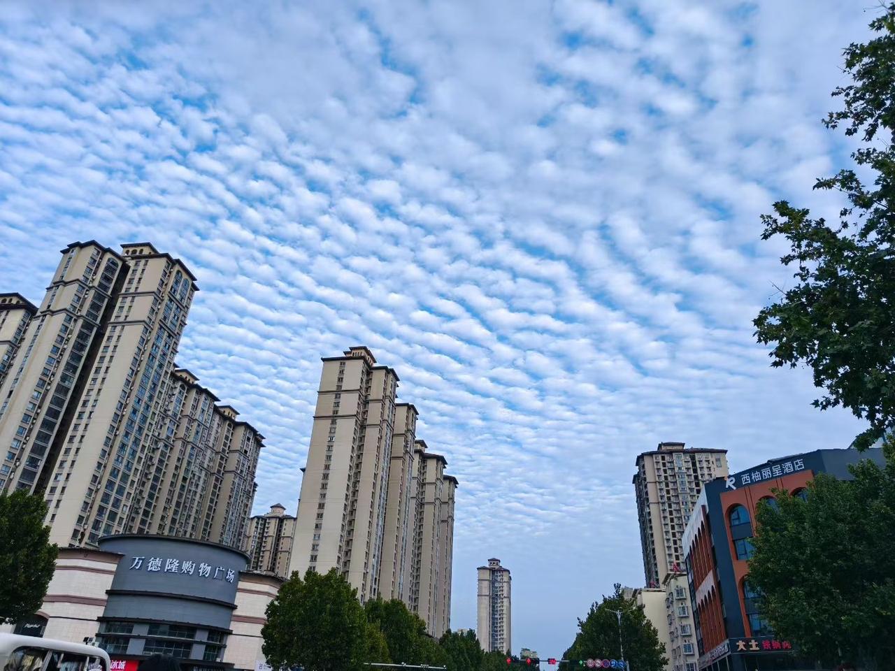 昨天下了一天的雨,终于可以出门了! 今天出门逛街,一抬头被天上的云惊艳到了!像鱼鳞一样一片一片铺在蓝天上,怪好看的。街道两边的高楼立在那儿,显得格外气派!路边的树绿油油的,给这城市街景添了不少生气。这样的天,这样的景,逛起街来都觉得心情倍儿好,生活里的小美好就藏在这些不经意的瞬间里呢。