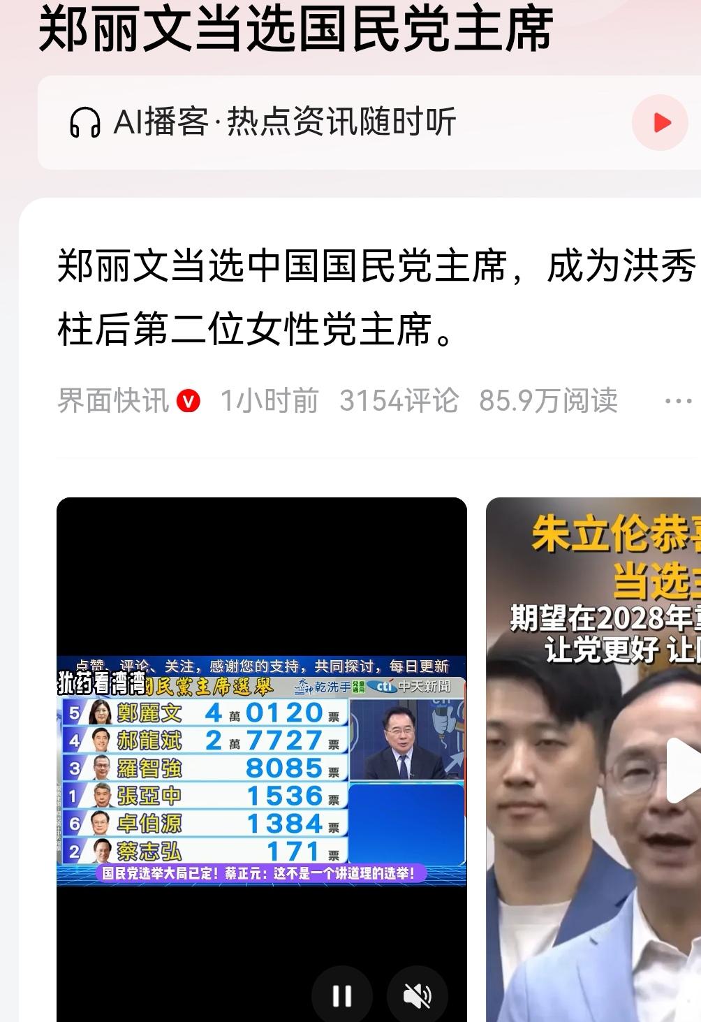 首位女主席!国民党迎来洪秀柱后第二位掌舵女性。 郑丽文当选中国国民党主席,成该党历史上第二位女性党魁。此次选举结果引发岛内外高度关注,朱立伦已公开祝贺,并表示“期望在2028年重新让党更好”。该消息发布1小时内阅读量突破85万,冲上首位。 女性领袖接连掌舵,能否为百年老党注入新活力?两岸路线走向备受瞩目。 你看好郑丽文带领下的国民党吗?