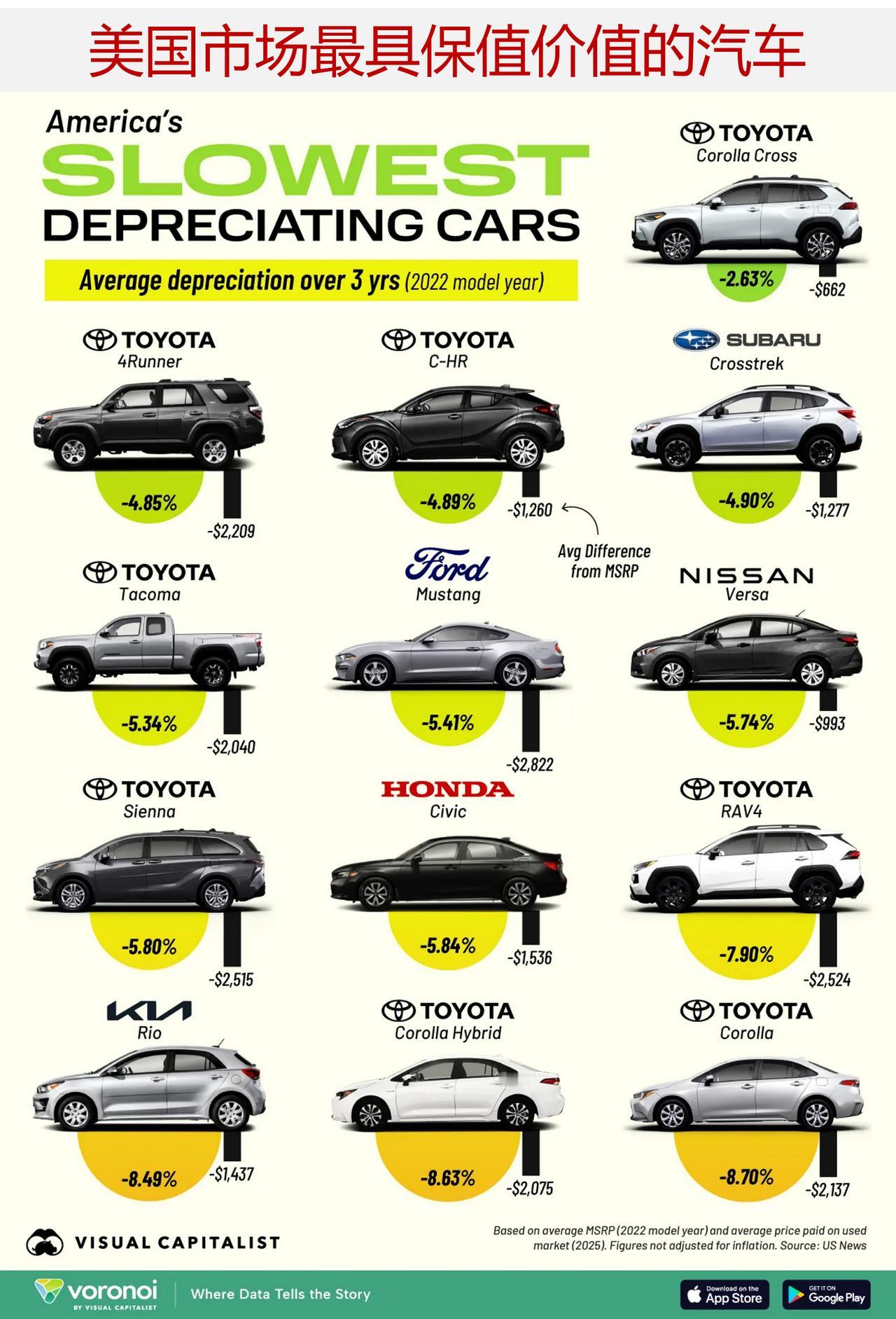 2025 年美国市场哪款车保值性最佳? 汽车是人们所做出的最重要的消费之一,但与房产不同的是,汽车的价值会迅速下降。 下图列出了截至 2025 年美国市场上保值性最佳的 13 款汽车排名,图中展示的所有车型均为 2022 年款。 该图表中的数据由U.S. News编制,对 2022 款车型的售价及转售趋势进行了分析。该数据衡量了这些汽车在三年后相对于厂商建议零售价所减少的平均价值,其计算方式包括百分比和美元金额两种形式。 ——丰田在价值保留方面排名第一 丰田汽车一直以来在可靠性和性价比方面的良好声誉,使其在二手车市场上的价值持续得到提升。 卡罗拉锐放位居榜首,在三年时间里贬值幅度仅为 2.63%(即减少 662 美元)。其他丰田车型,如超霸、C-HR 和塔科马,在这方面的表现也相当出色。 今年早些时候,丰田汽车在美国被列为最可靠的汽车品牌第四名,这解释了其在新车市场和二手车市场都拥有稳定需求的原因。 ——日本汽车通常贬值速度较慢 除了丰田之外,其他日本品牌的表现也相当出色。斯巴鲁的“ Crosstrek ”位居第四,其贬值率仅为 4.90%,这或许是因为其具备全轮驱动的多功能性。 像本田思域和日产骐达这样的小型汽车也位列前十,它们兼具高效、实用和可靠的优点,颇具吸引力。 ——福特野马长存 在众多日本汽车之中,福特野马脱颖而出,成为此次排名中唯一一款美国车型。 这款福特野马的平均贬值率为 5.41%,其经久不衰的设计和品牌传承使其能够避免许多美国车型常见的大幅贬值现象。 另一个原因可能是,福特野马是目前唯一仍在销售的汽油驱动的跑车,而雪佛兰科迈罗和道奇挑战者则已于近期停产。