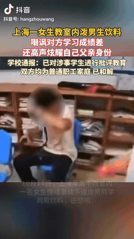 上海,一女生与男同学发生矛盾,于是女生在情绪激动下就泼男生饮料,还嘲讽对方学习成绩差,并且高声炫耀自己的父亲身份,而男子忍不住差点与她打架,然后被其他同学拦住了,最后两名学生被学校批评教育,而且双方均为普通职工家庭,目前已和解。 信息来源:杭州网 高中女生与男同学发生矛盾,女生端起饮料就往男同学身上泼,边泼边厉声喝道:“像你这种中考比我低30分的人,没资格跟我说话!” 说着第一瓶乌龙茶就从男同学头顶倒下,湿漉漉的校服和滴答声立刻把教室里所有人都吓了一跳。 等男生一脸懵坚持没吭声,女生又抄起第二瓶冰红茶,边泼边嘲讽:“你这样的只能去读中专大专!” 她还追着问,“你知道我爸爸干什么的吗?”那气势,跟拿着后盾到处作威作福似的。 男同学坐了几秒,擦完眼镜和耳机,终于没忍住,从凳子上一跃而起,一肘压向女生的脖子,还想把人拉到后面去。 旁边三个男生赶紧冲过来拉手,才没把这事儿闹得更凶。 整个过程手机直拍,共28秒,15号一晚上就冲上热搜,网友们炸开了锅。 学校那边17号火速联系了双方家长,还把男女同学分别做了心理辅导,按《中小学生教育惩戒规则》走流程。 宝山教委下结论:女生爸爸是普通企业职工,根本没什么后台;这事儿不算校园霸凌,只是口角升级。 对于那传男生先造谣的事儿,学校说要保护未成年隐私,暂不公开。 评论区又分成两派:一拨人骂女生炫成绩、炫家底,非得给她记过不可;另一拨说要是不是真的有谣言压身,女生泼两下也算情有可原。 大多数人最后还是觉得,不管谁先谁后,动手动脚、泼水侮辱都不对,学校和家长该好好管一管。 说白了,这事不是谁爸厉害不厉害的锅,是家庭教育和同学相处的锅。 通过这事告诉我们:孩子要先学会尊重别人,管好自己的脾气,别把成绩和家底当武器,这是一种不健康的心理。 而家长别再拼命给物质,要多注重孩子的心理教育,不要让孩子有一种爱慕虚荣的不好风气,要学会尊重每一个人,每个人都是平等的。
