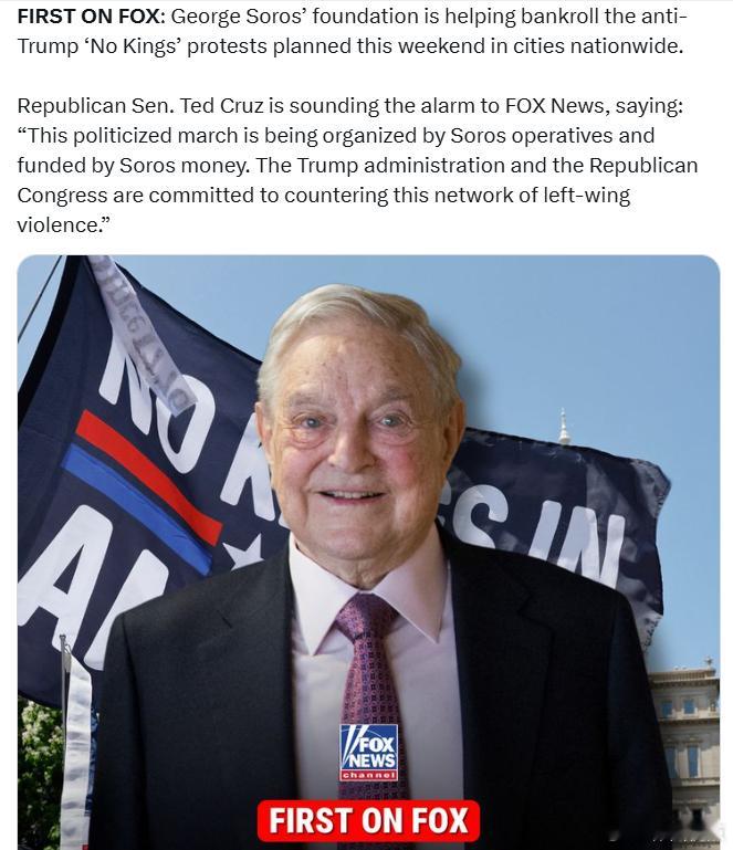共和党参议员特德·克鲁兹向福克斯新闻称:“这场政冶化的油行由索罗斯的操纵者组织,并由索罗斯资金资助。特朗普政府和共和党国会致力于对抗这张左派暴力网络。”