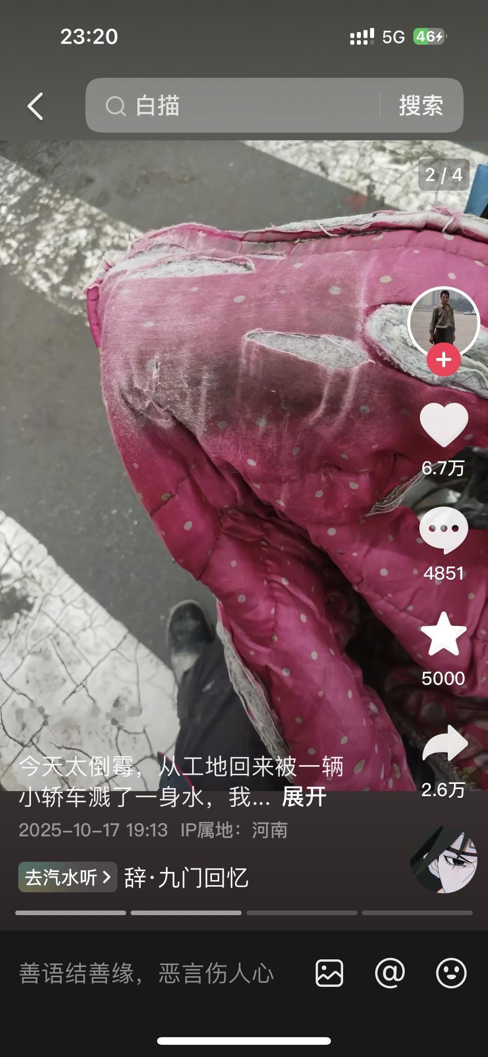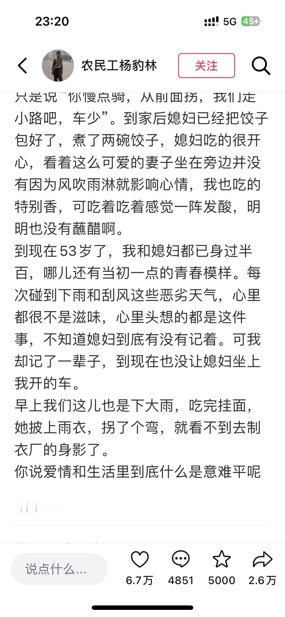 一个农民工的随笔,朴素中蕴含着平凡的幸福与遗憾,看起来有种沈从文的神韵。 他写打工回来媳妇骑电动车去接他,他写被雨中的小轿车溅了一身水,他写人到中年也没能买个车载着媳妇,他写回到家有热乎的饺子,他写妻子急匆匆去工厂上班的紧迫。 生活就是这样的,没有太苦也没有很有钱,普普通通的活着有个自己的幸福小家,这才是浮躁社会应该火的文笔啊。