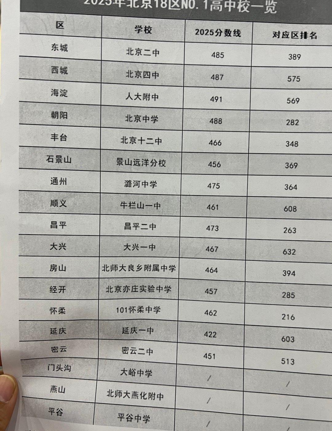 家里有明年中考的娃可以看看北京中考录取分数线TOP20高中的分数(图1)和区排名
