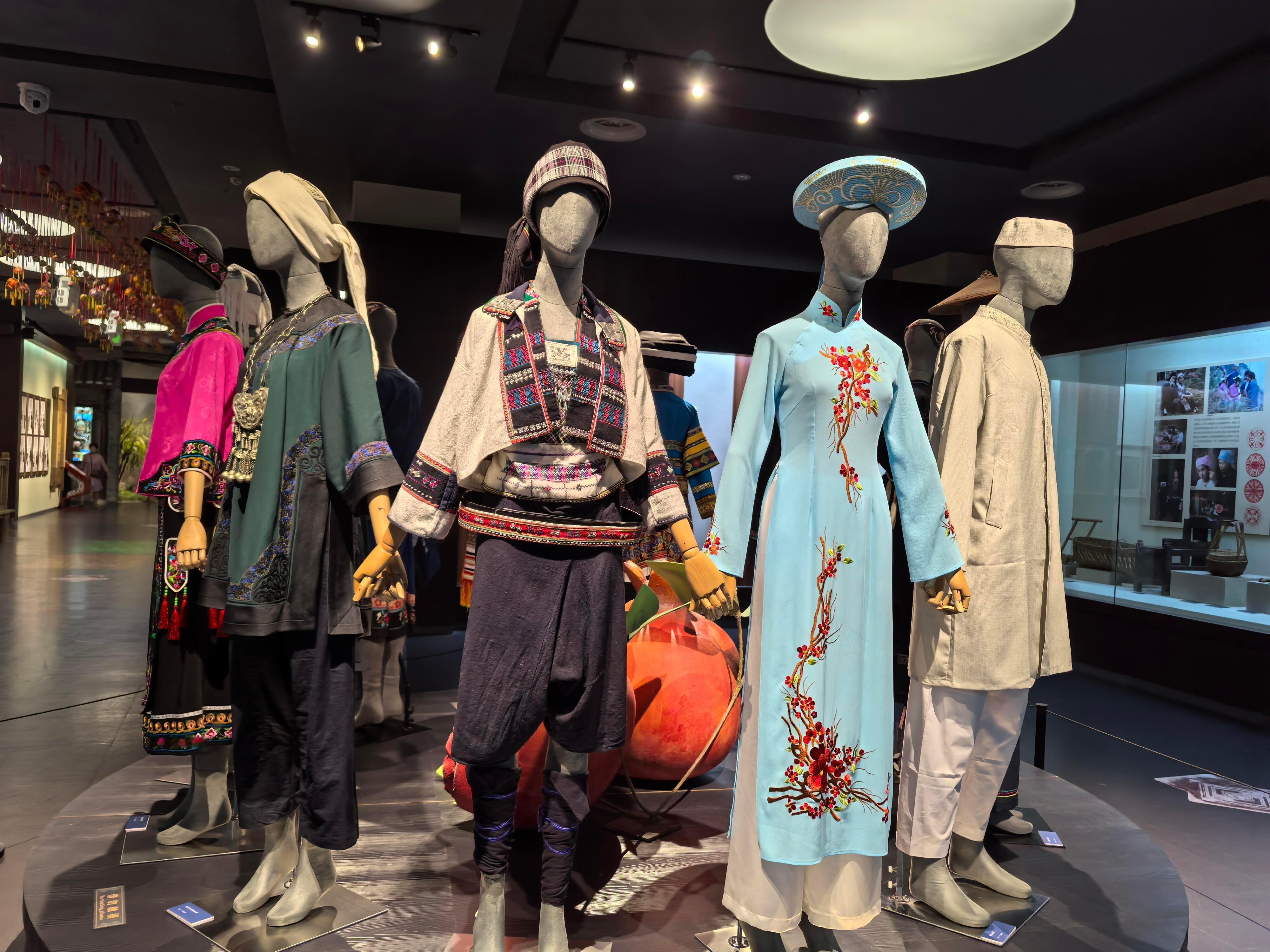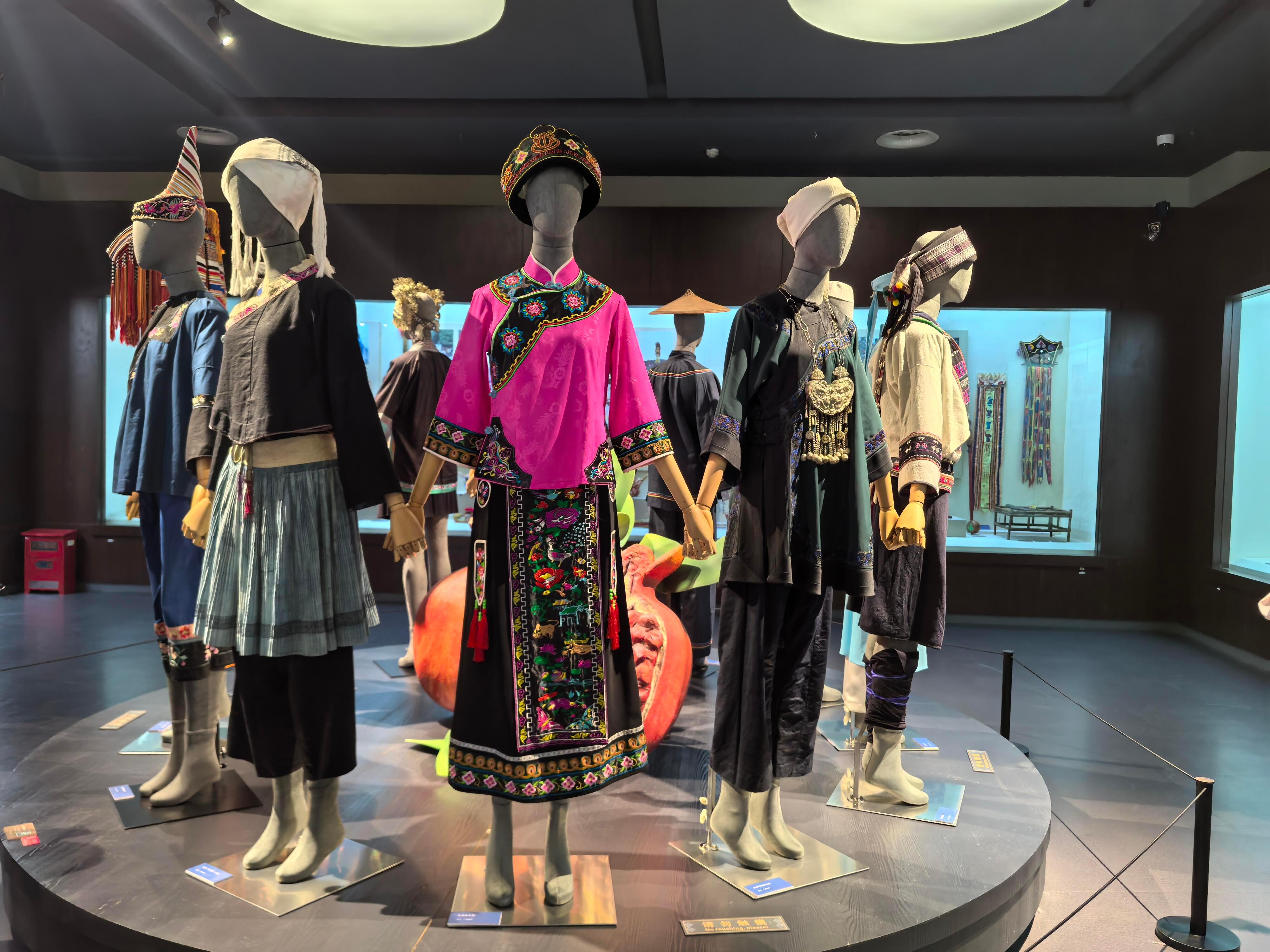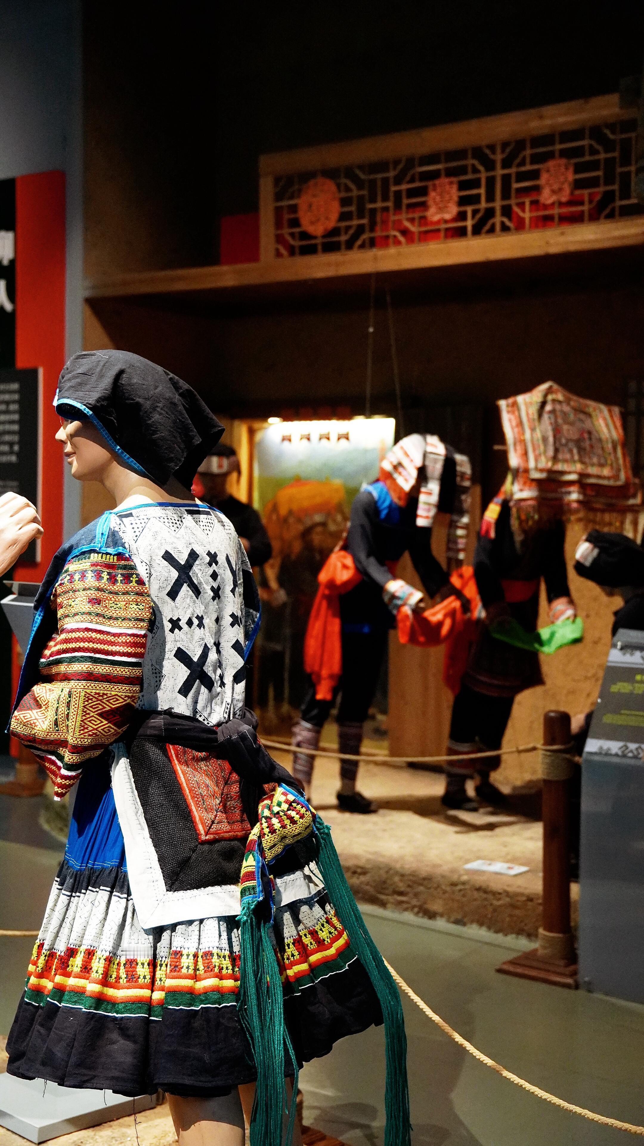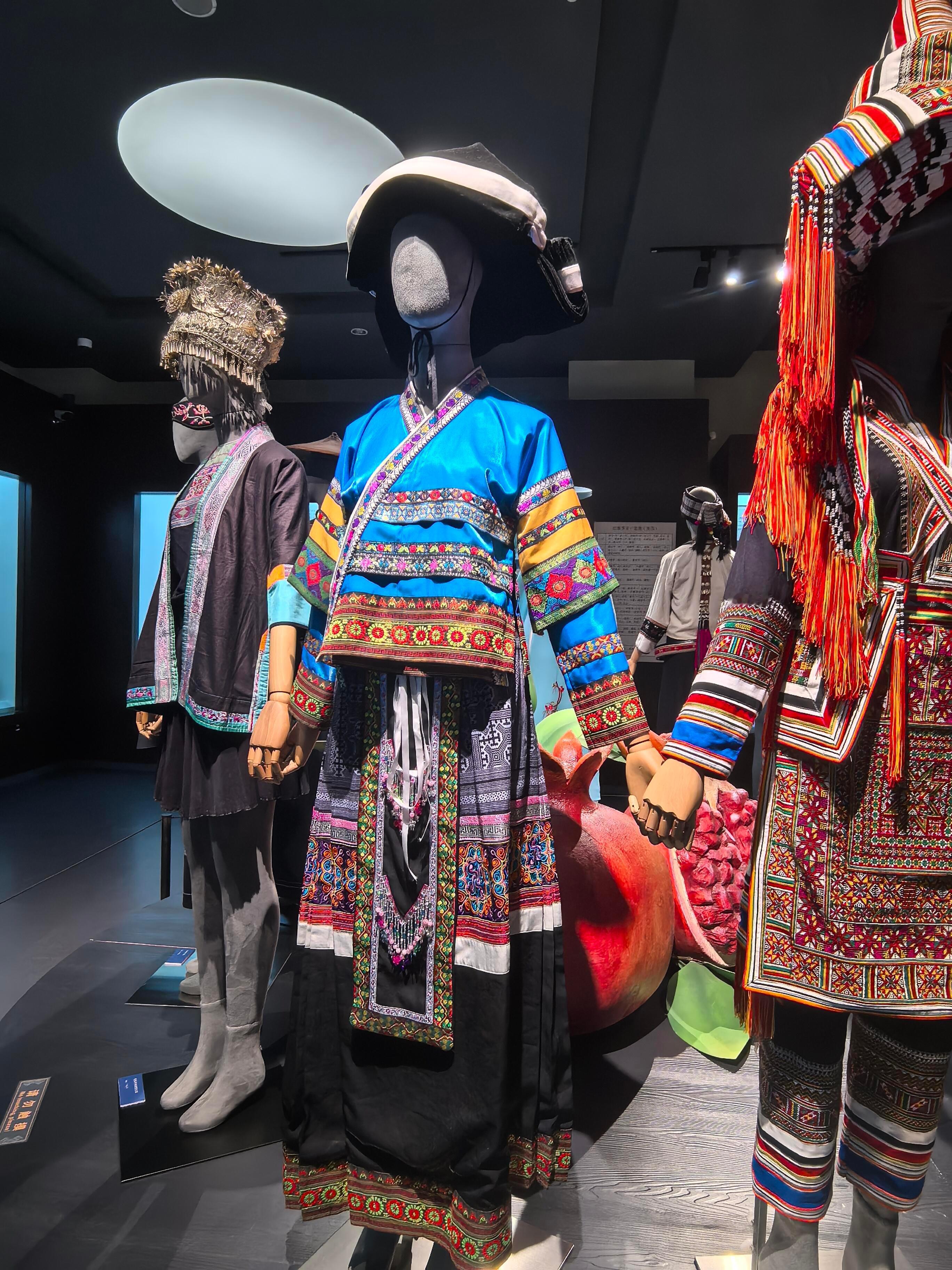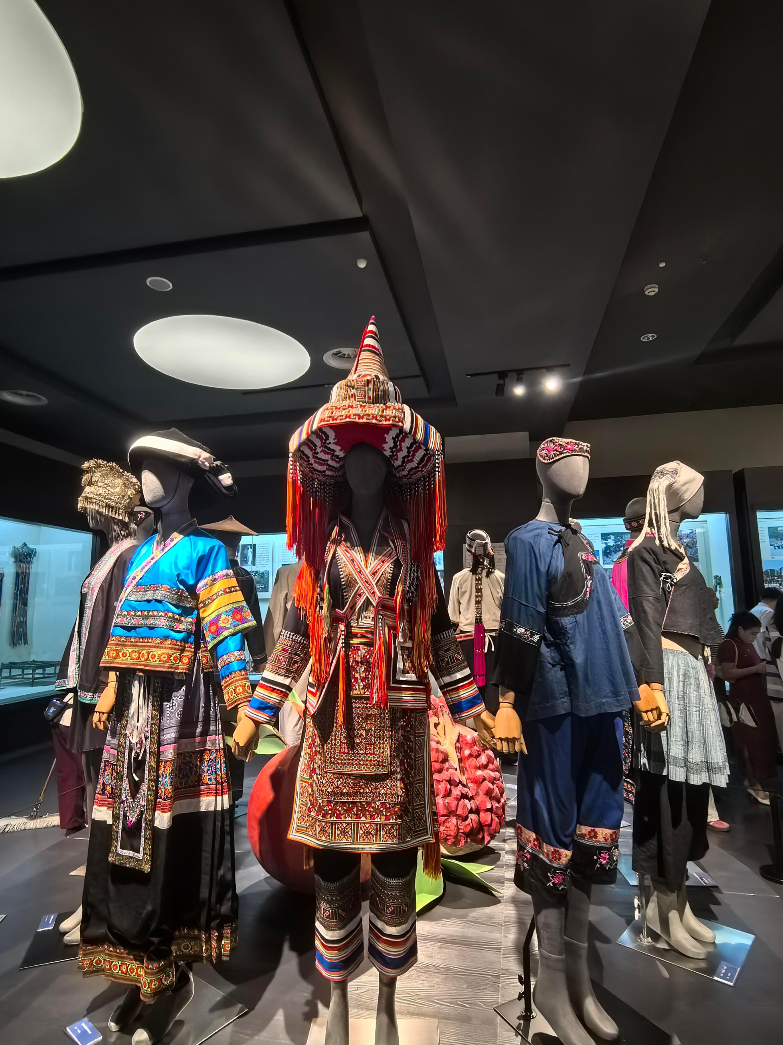 三楼“霓裳羽衣”展厅是服饰爱好者的天堂,陈列着壮、瑶、苗、侗等多民族服饰,连融合民族元素的隆林高山汉服饰都有,精美刺绣与亮眼配色搭配特色配饰,尽显民族审美。