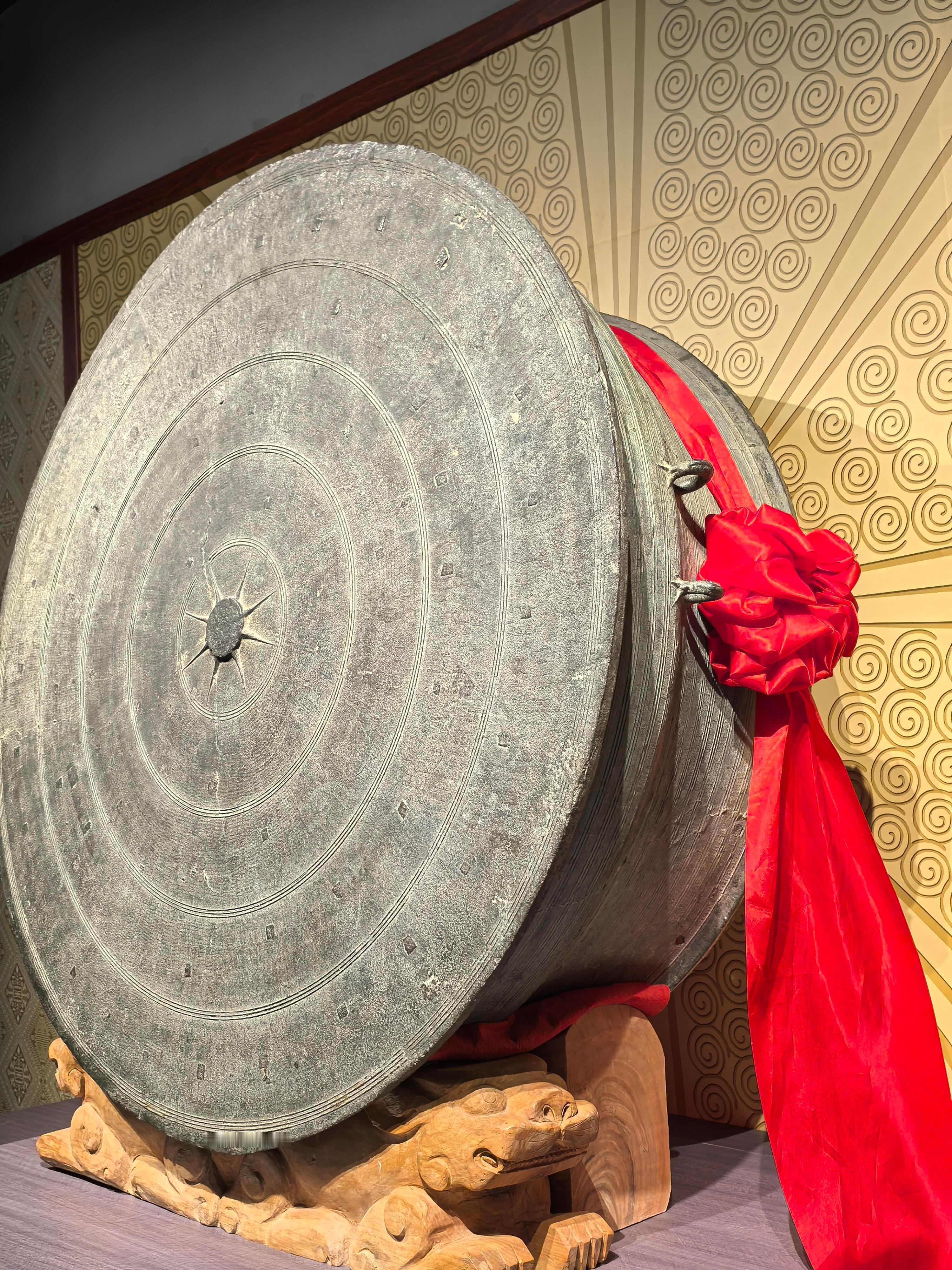 二楼不仅有让人忍不住“剁手”的文创店,还展示着南方祭祀重器——铜鼓。壮族铜鼓是国家级非遗,与北方的鼎地位相当,承载着深厚文化底蕴。馆内还能了解到壮族蚂拐节,这一节日体现对自然的敬畏,通过祭祀祈愿丰收,是文化传承的重要载体。