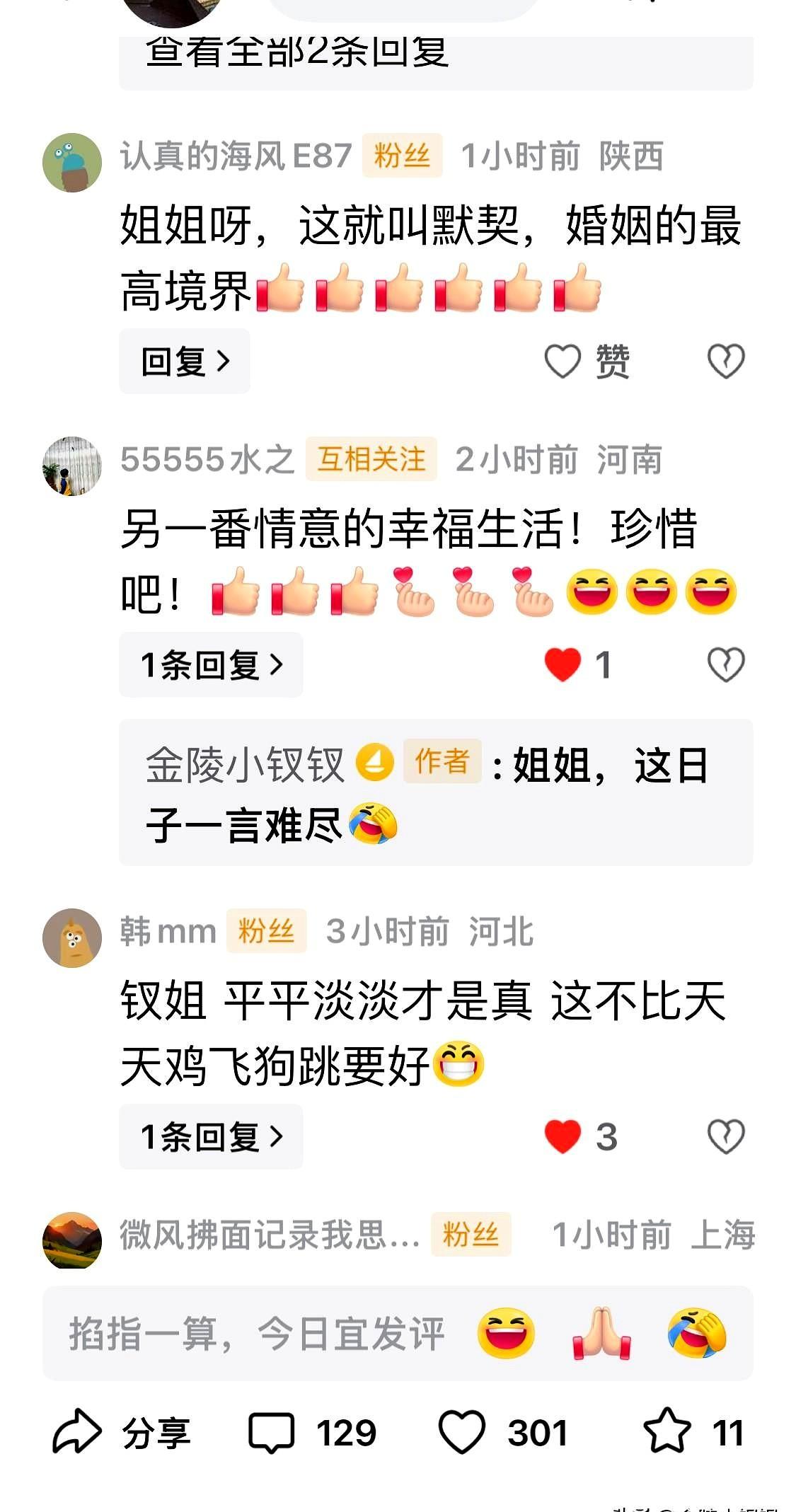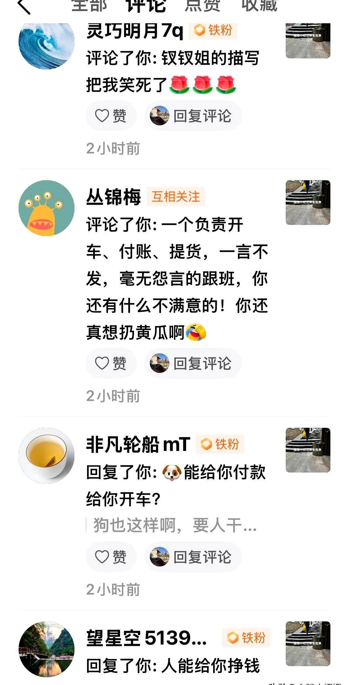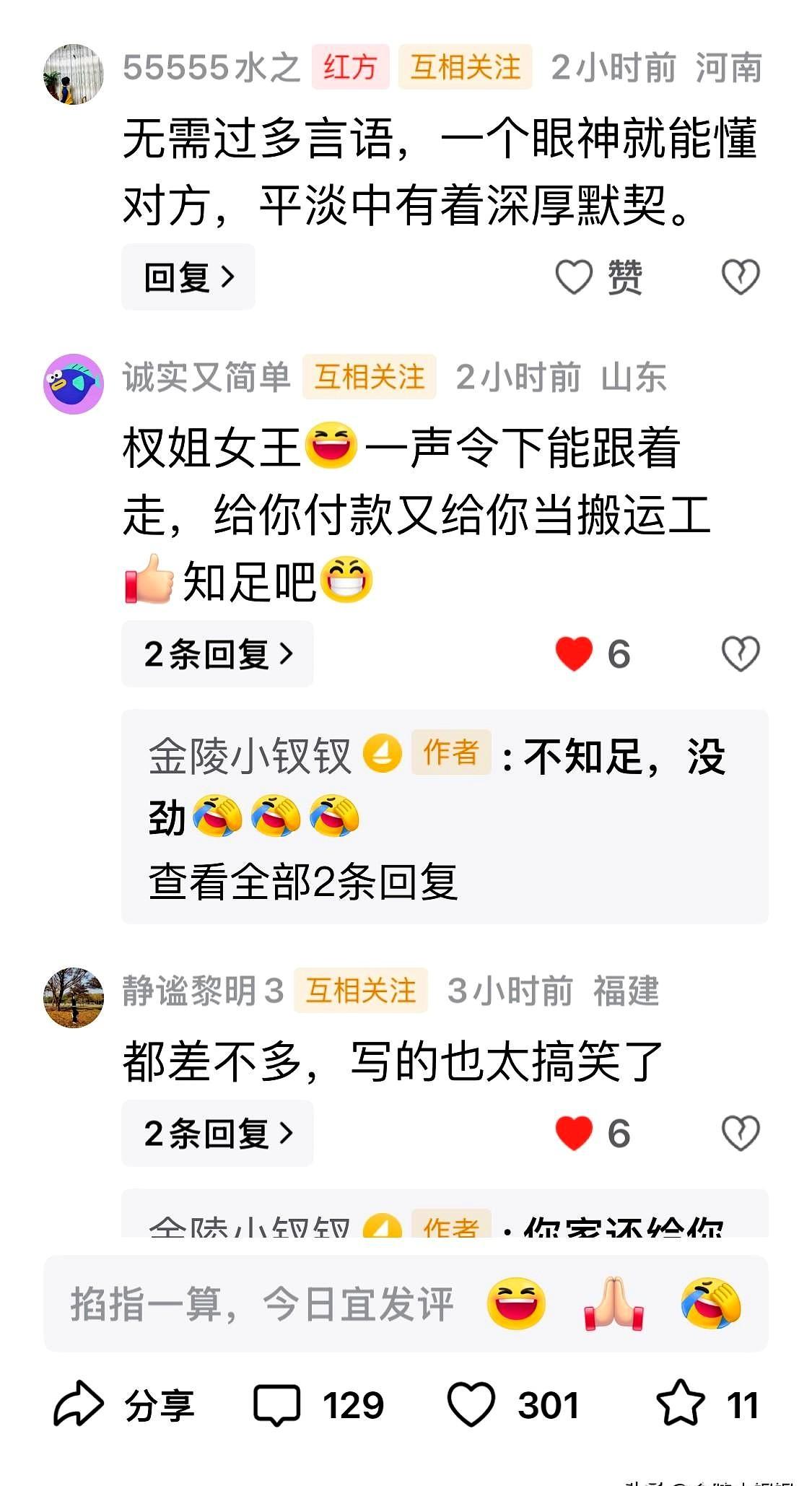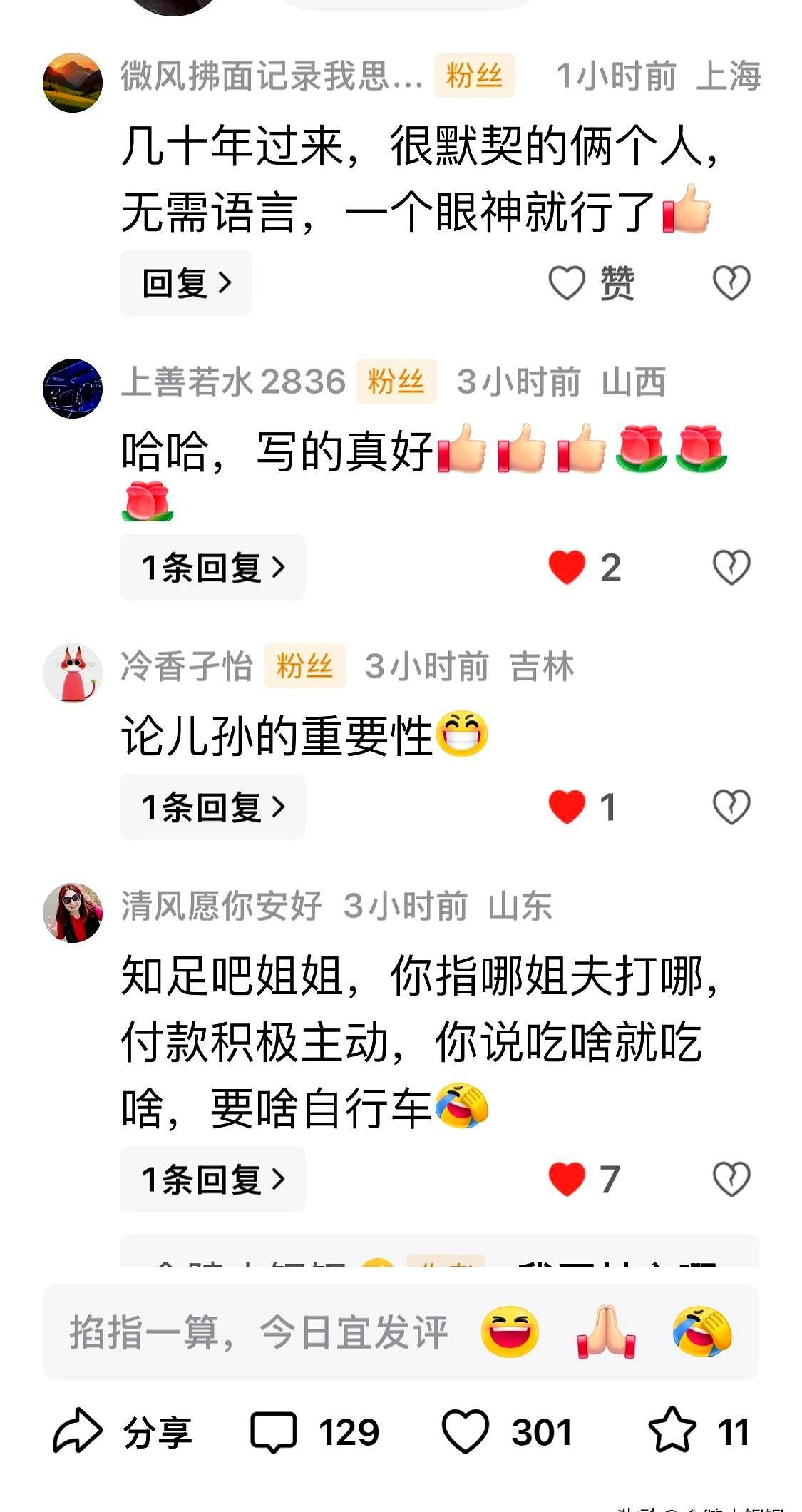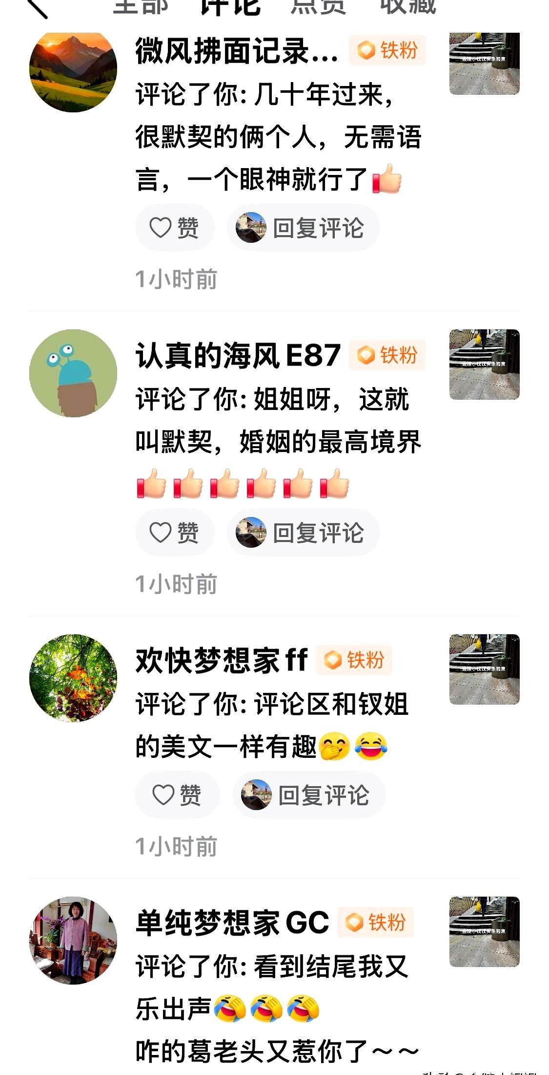 这一边倒的让我直接醉了! 我写了一个微头条,吐槽葛老头,网友们却一边倒地批我,说太默契了,这是婚姻的最高境界。 我的意思是俩人不说话,这样的跟随和狗有什么区别? 结果越描越黑,有网友说评论区更精彩。 我吓得不敢再吐槽了。 网友对此说道: 姐姐知足吧,我家老头只下楼在小区门口帮我提菜,而且还是超级重的情况下,早晨一起买菜他根本起不来。 哈哈哈,我的评论也 上榜了,看问题,一个人有一个人的角度,角度不同,理解就不同。[祈祷] 我特别敬佩大姐,吃苦耐劳,聪明睿智,动手能力超强,乐观向上[赞][赞][赞] 钗钗如果家里有个管盘子管碗,嘚啵嘚啵腻歪的老头多烦人,影响你写作[呲牙]向葛老头这样多好,平时两不妨碍,看你不忙泡壶茶叫你一块喝一杯多好。
