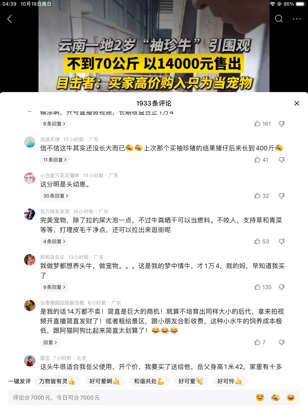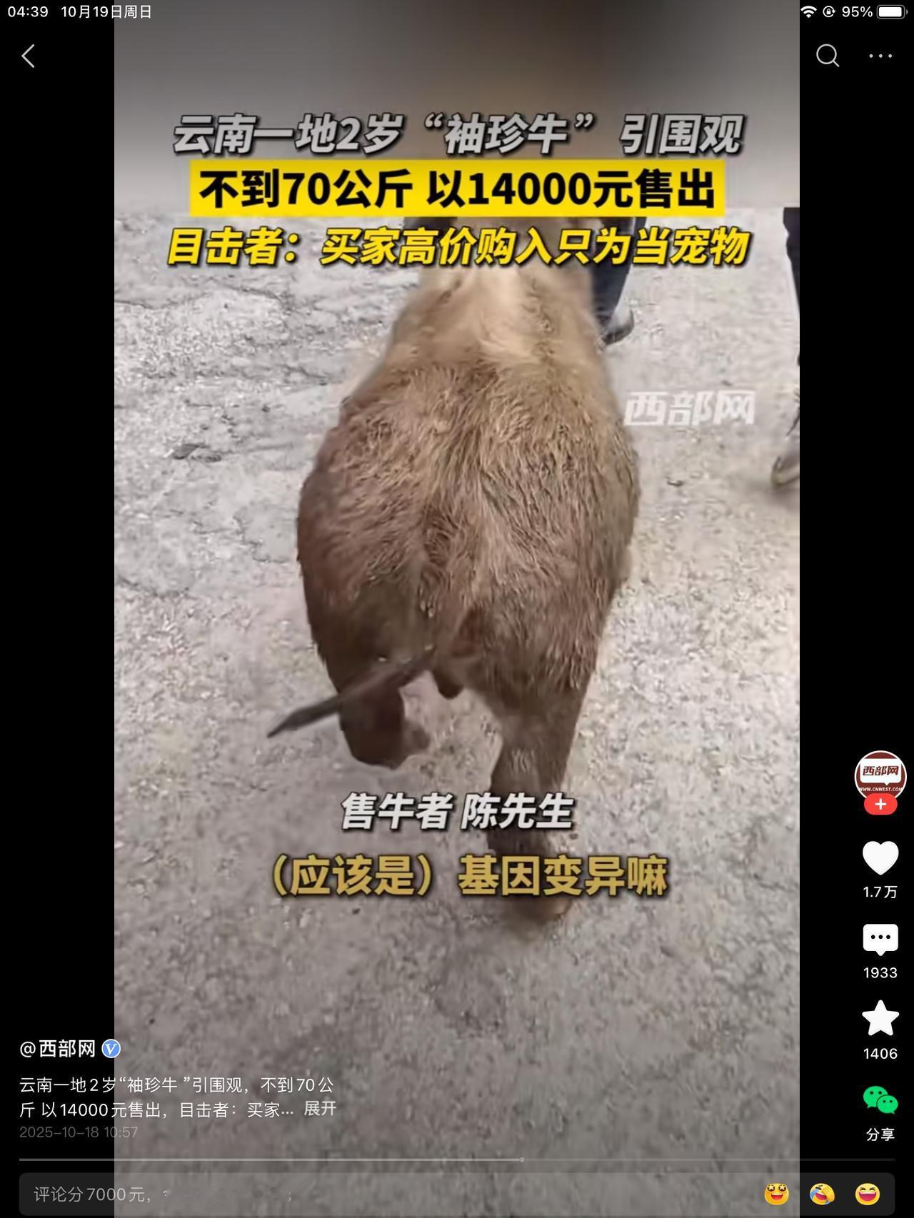 这个侏儒牛不到七十公斤,卖了14000。比肉牛都贵。让人纳闷的是,好多人在评论区都说不贵,想买回去,繁殖。生出更变异的牛。配种就能赚钱。 还有的说买回去直播,赚翻了。 有要拉去景区合影收费的。更有甚者要买给142的岳父犁地。有才华的人实在是太多了。还是评论区能学到知识。