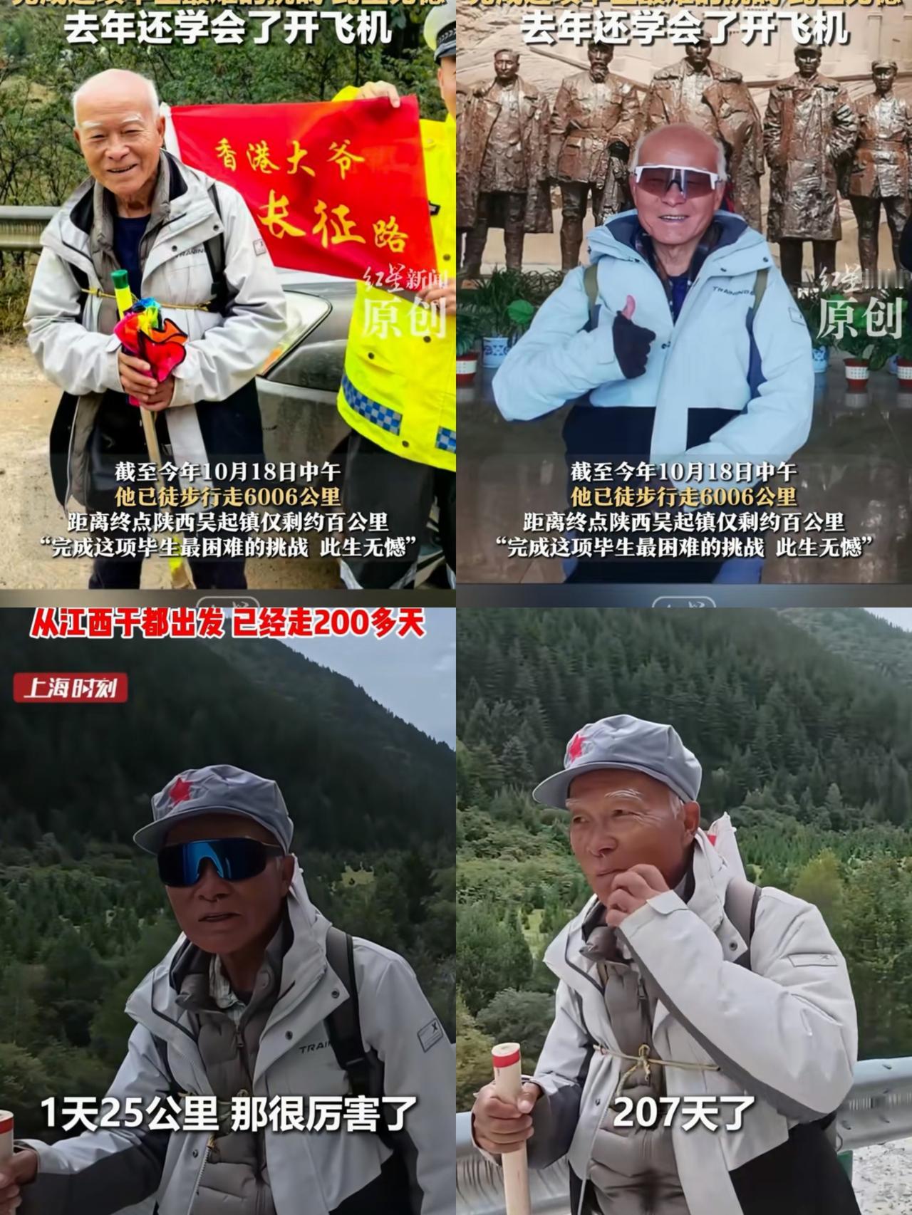 这位老人彻底火了! 不仅香港人知道了,连外国网友都知道! 而且人民日报都为他点赞! 香港74岁的郑镇炎老人,为了重走长征路,居然徒步从江西于出发,己经走了二百多天了,他用脚步传信仰,让更多人懂历史,太让人敬佩!他走的不只是平坦了的路,更是用毅力丈量信仰的足迹,风餐露宿里藏着的全是老一辈人对初心的坚守,这份执着比任何故事都动人! 当年的红军是与天斗与地斗与敌人斗,每天都无数次的战斗,这不只是中国历史上的伟大的壮举,同时也是人类历史上的伟大壮举!致敬伟大光荣的革命先辈们!同时致敬这位勇敢的老人![玫瑰][玫瑰][玫瑰]