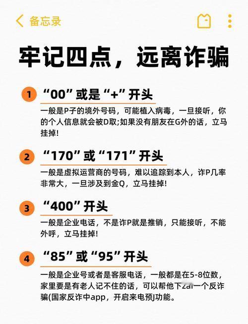 遇到四类诈骗电话切勿接听:400开头号码多为企业客服,无外呼功能;00开头系国际长途,无海外关系需警惕;95开头八位号码仿冒银行(正规银行多为五位);0169开头可能引发网贷陷阱。任何情况都可能造成财产损失,请直接挂断 在这个信息爆炸、诈骗手段层出不穷的时代,面对每天蜂拥而至的陌生电话,我们是不是也变得越来越“麻木”? 但千万不要以为“接听无妨”,因为一个不经意的举动,可能就让你陷入一场精心设计的陷阱,财产安全就此受到威胁。 今天,就让我们来揭开那些隐藏在数字背后的“陷阱代码”,警惕四类诈骗电话,让你的财产安全免受侵害。 首先,400开头的号码。很多人觉得企业客服电话一定是官方正规,听着“400”也就放松了警惕。 殊不知,大部分企业客服并没有外呼功能,更不用说在没有确认身份的情况下随意接听。 如果你接了,很可能会被“钓鱼”链接诱导,或者成为他人诈骗的工具。 这些号码多是用来迷惑、骗取信息的“假面具”,千万不要掉以轻心。 其次,00开头的国际长途号码。 有人觉得海外关系、跨境业务就得靠这个号码联系,殊不知,很多诈骗团伙也会利用这个号码来冒充“海外公司”、“国际客服”,试图骗取你的信任。实际上,如果没有明确的海外合作关系,接到这样的电话就要提高警惕。 不要被“国际范”迷惑,保持冷静,核实对方身份才是王道。 第三,95开头的八位号码。很多人收到类似的号码,第一反应就是“是不是银行的?”但事实是,正规银行的客服电话通常是五位数,八位号码的仿冒短信或电话极有可能是“假冒银行”的伎俩。 诈骗分子通过类似号码,试图窃取你的银行信息、验证码,一旦上当,损失可能无法挽回。 切记:银行官方客服电话只认五位数,任何八位、十位的都要提高警惕。 最后,0169开头的号码。这类号码被频繁用于网络贷、网约车、各种“极速借款”广告,很多人一不小心就会陷入“高利贷”、“网络陷阱”。 诈骗分子利用你的借款需求,设置“低门槛、秒到账”的陷阱,实际上可能让你陷入深不见底的债务泥潭。 面对陌生的“快速借款”电话,千万不要轻易相信,更不要轻易操作。 总结一句:在这个信息泛滥、诈骗手段日益狡猾的时代,保持警惕、理性判断才是最好的防线。 任何情况,都可能造成财产损失,直接挂断、不要轻信任何陌生来电,才是保护自己最简单有效的方法。 让我们共同守护自己的财产安全,也提醒身边的人提高警惕,不成为下一位“受害者”。 你的每一次谨慎,都是对自己最好的守护。警惕来电陷阱,守护财产安全,从我做起!