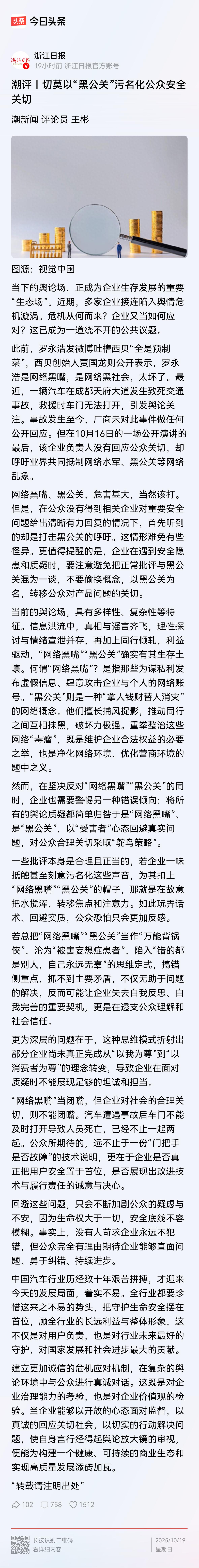 浙江日报,发文谈“黑公关”:切漠以“黑公关”污名化公共安全关切! 这应该是继第一财经、蓝鲸视频后,更大级别的官媒了!也算是定调了,说你是让你反思和改进,而不是反过来让你来冲击和扣帽子的! ​​​