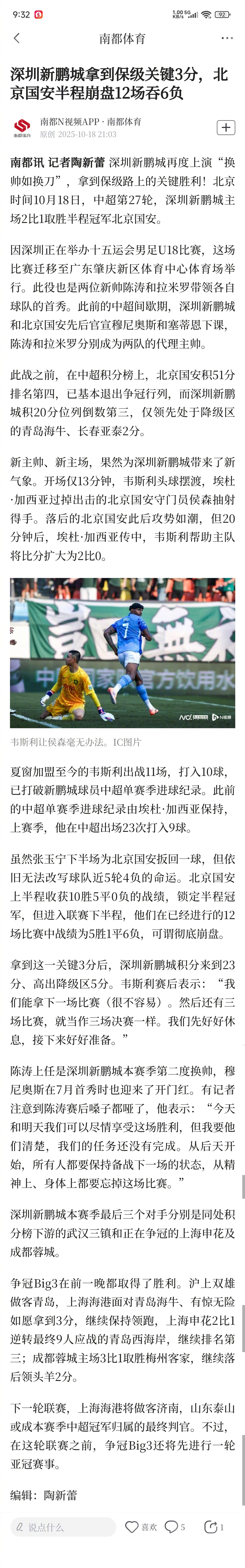 【#深圳新鹏城拿到保级关键3分#,#北京国安半程崩盘12场吞6负#】深圳新鹏城再