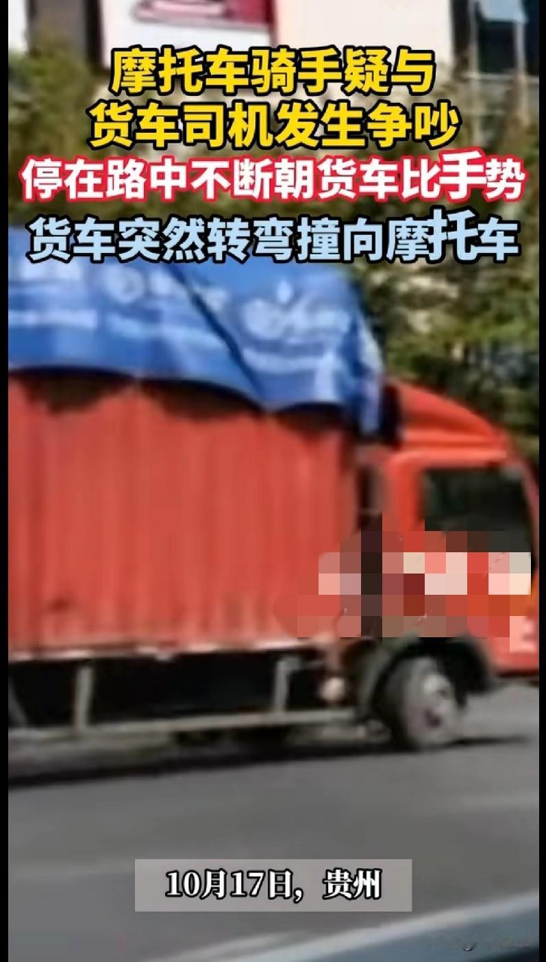 “家人们快看这惊险一幕!贵州一摩托车骑手和货车司机吵起来,骑手停在路中间不停比手势,结果货车突然转弯就撞上去了! 这操作也太吓人了!在路上吵架赌气太危险了,评论区都在说‘千万别路怒,小命要紧’,有人后怕‘这要是速度快一点后果不敢想’。 咱就说,开车骑车都得冷静,别为了一时之气把安全抛脑后。你们遇到过路怒的情况吗?快来说说你是咋处理的!”