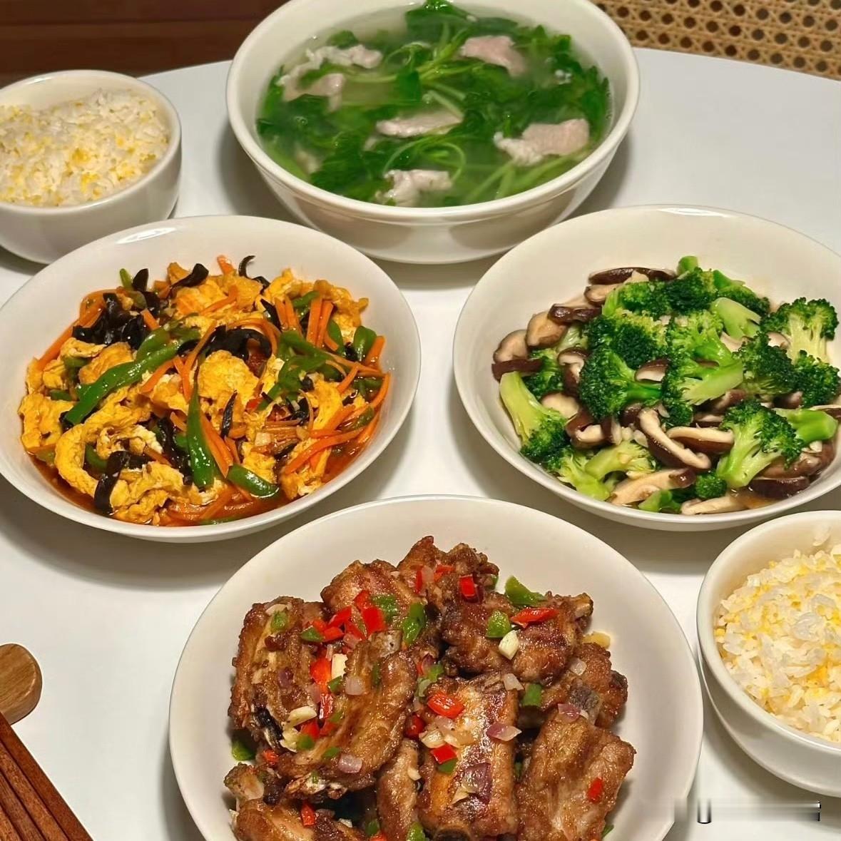 一桌是酸辣排骨配鲜香时蔬,瘦肉汤清润解腻;另一桌是红烧带鱼入味,酸辣土豆丝爽口,还有山药木耳的脆嫩与蛋花汤的暖。 在烟火缭绕的厨房与餐桌间,把平淡的日子,烹成了满是幸福的滋味。”