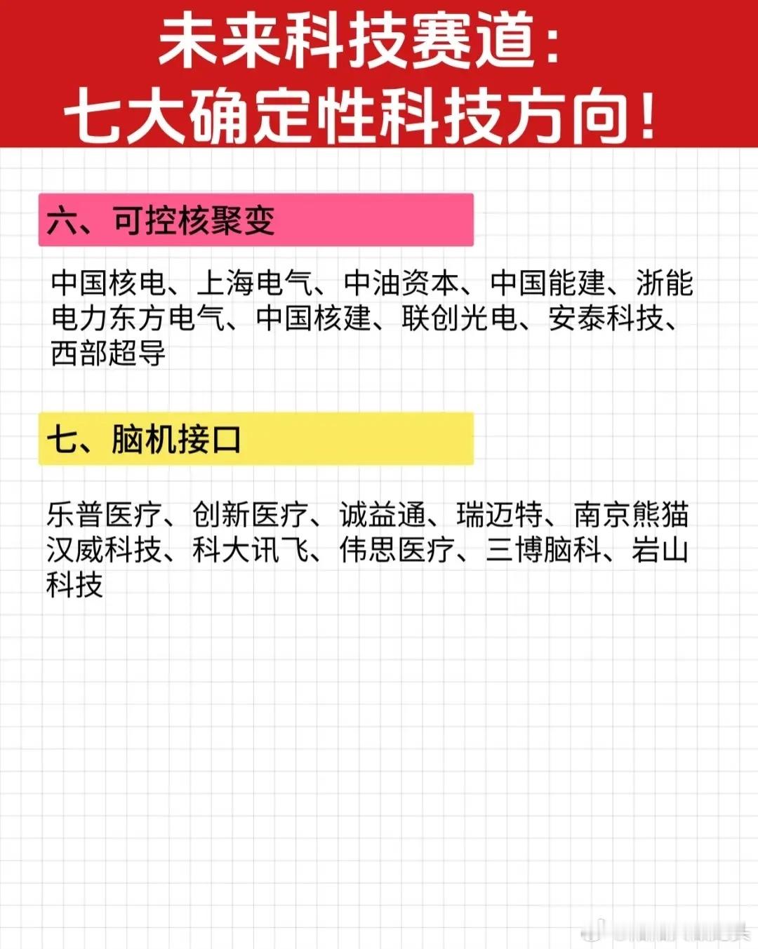 总结来看,这七大科技方向覆盖了从底层硬件(如芯片、半导体设备)、关键技术(如AI算法、量子计算、液冷散热)、新兴应用(如人形机器人、脑机接口)到未来能源(如可控核聚变)的全链条,既体现了科技创新的前沿性,也突出了国产替代与自主可控的战略需求,为判断未来科技产业发展重点与投资机会提供了系统性参考。A股[超话]