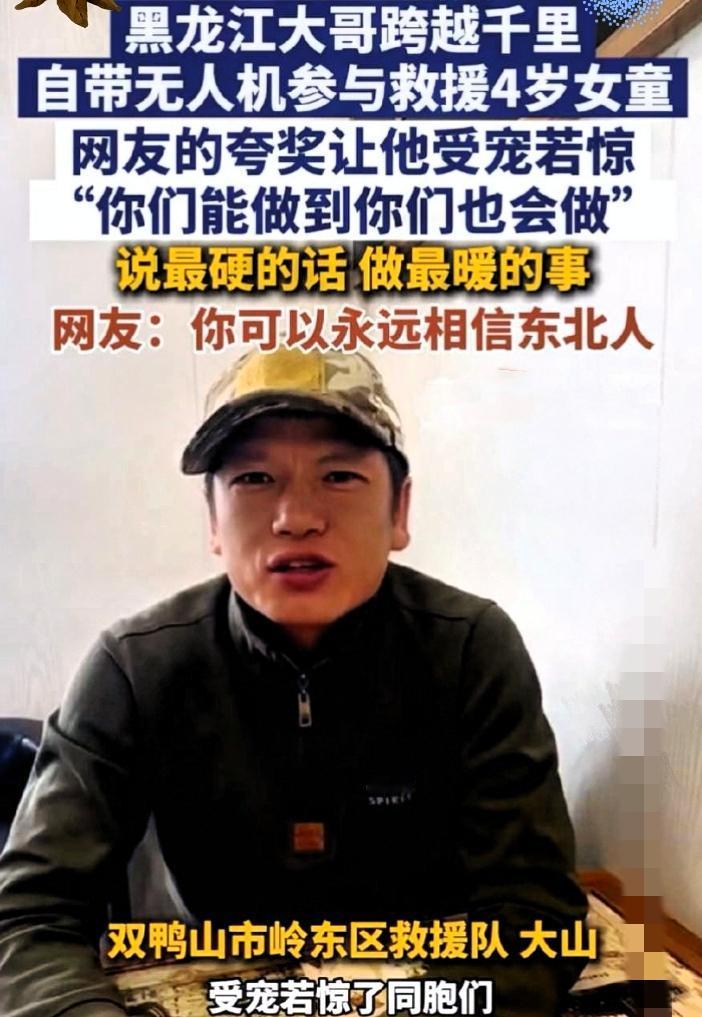 昨天用无人飞机黑龙江双鸭山市找到孩子的这位大哥说,昨天政府有关部门问他了,找到孩子有啥要求。 大哥那叫一个豪爽,直接说:“有啥要求,孩子找到就是天大的喜事!”好多人之前都觉得,孩子怕是凶多吉少,可没想到能活着回来,这对大家来说,可不就是最大的惊喜嘛!大哥还感慨,1000多公里路没白跑,“一方有难,八方支援”可不是嘴上说说。 从这大哥身上,咱看到的不仅仅是东北人的豪爽,更是人性中最质朴的善良和担当。在他心里,孩子平安才是最重要的,这种纯粹的善念,太让人敬佩。这也提醒咱,在生活里,遇到别人有难,就得像大哥这样,实实在在地去帮。 你们身边有没有这样豪爽仗义的人呢?快来说说呗。